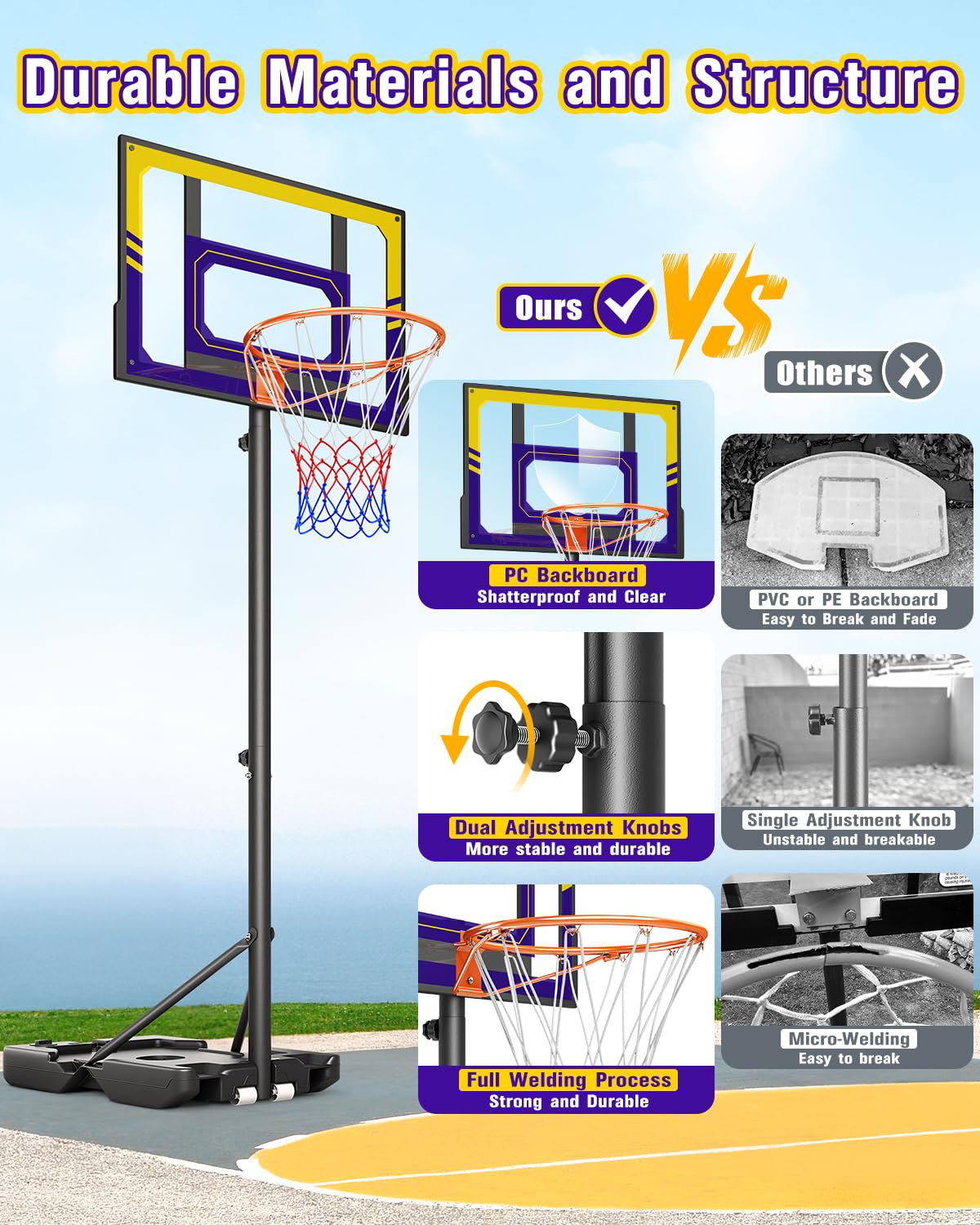 Easy to Assembly & Move: The basketball goal outdoor features a simplified installation process, complete with a detailed instruction manual and installation video for easy setup. Equipped with built-in wheels, it moves effortlessly to your backyard, garage, court, driveway, or anywhere you want to play