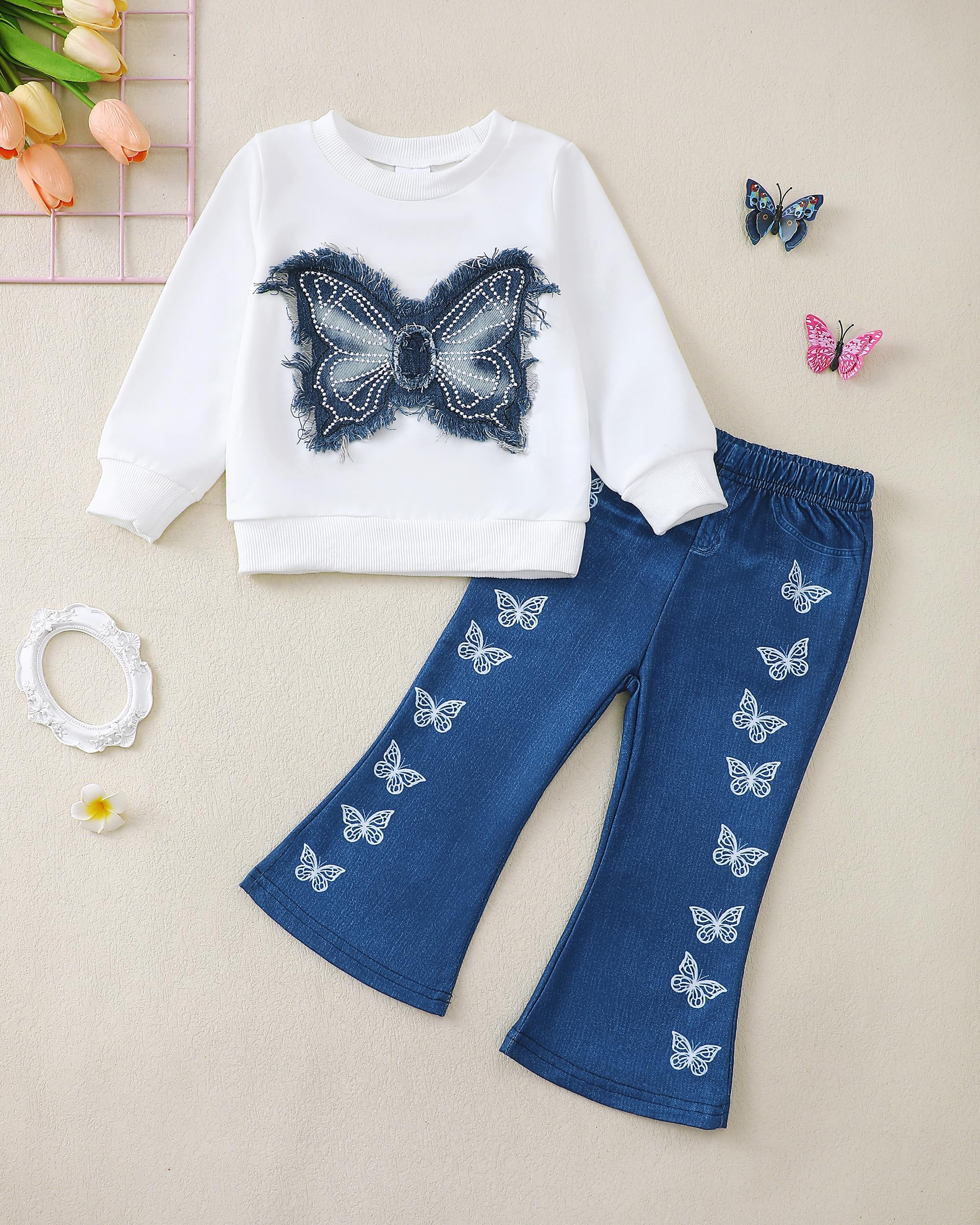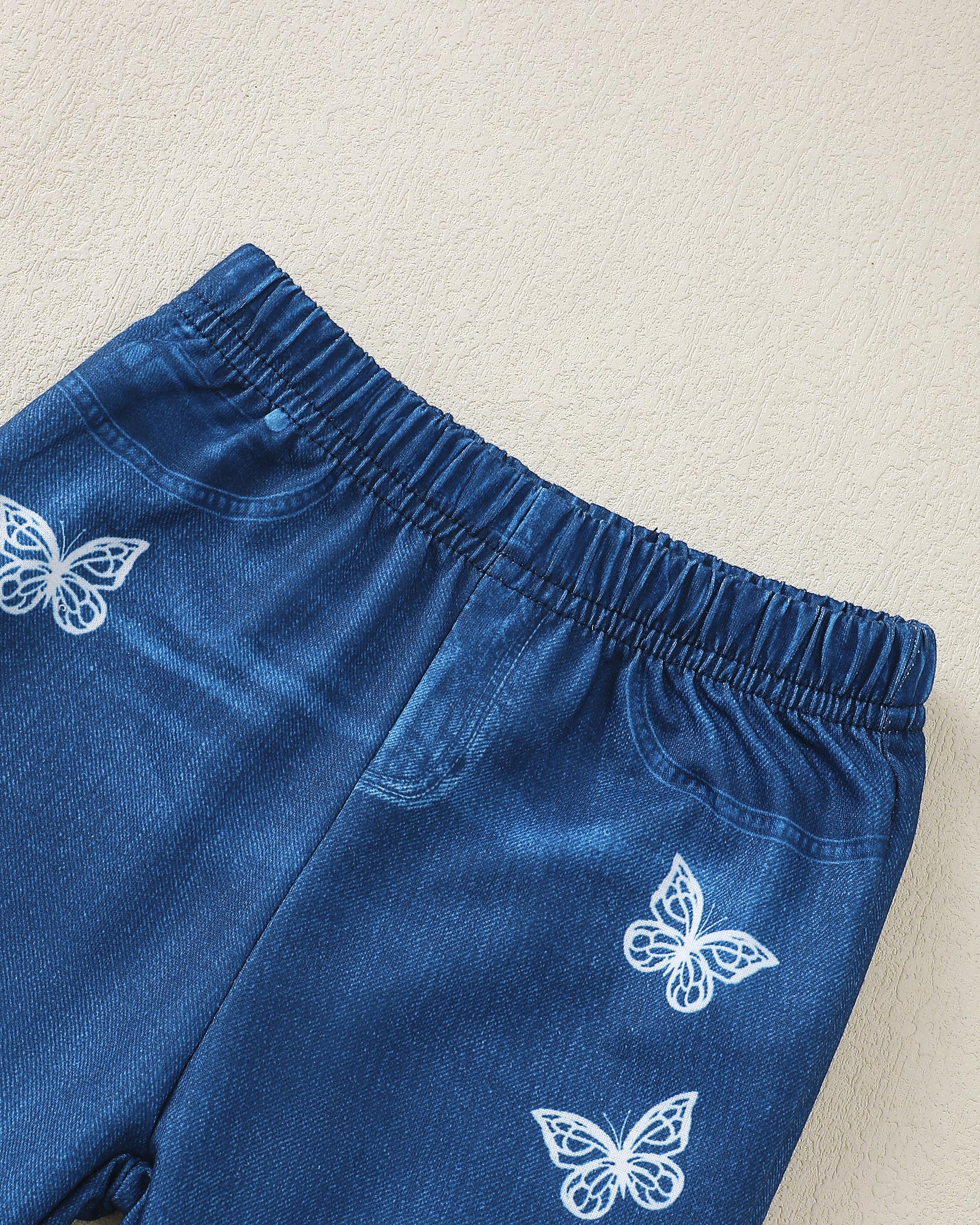 Fun Design: Our baby girl bell bottom outfit feature playful prints of flowers, cats, butterflies, and girl faces on the top. These baby pants showcase a trendy faux denim print, offering the look of denim with added softness. The elasticated waistband ensures a comfortable, perfect fit, making this clothing set ideal for casual wear or for creating a chic look. Please note: these are not real denim, and the pants do not have pockets!