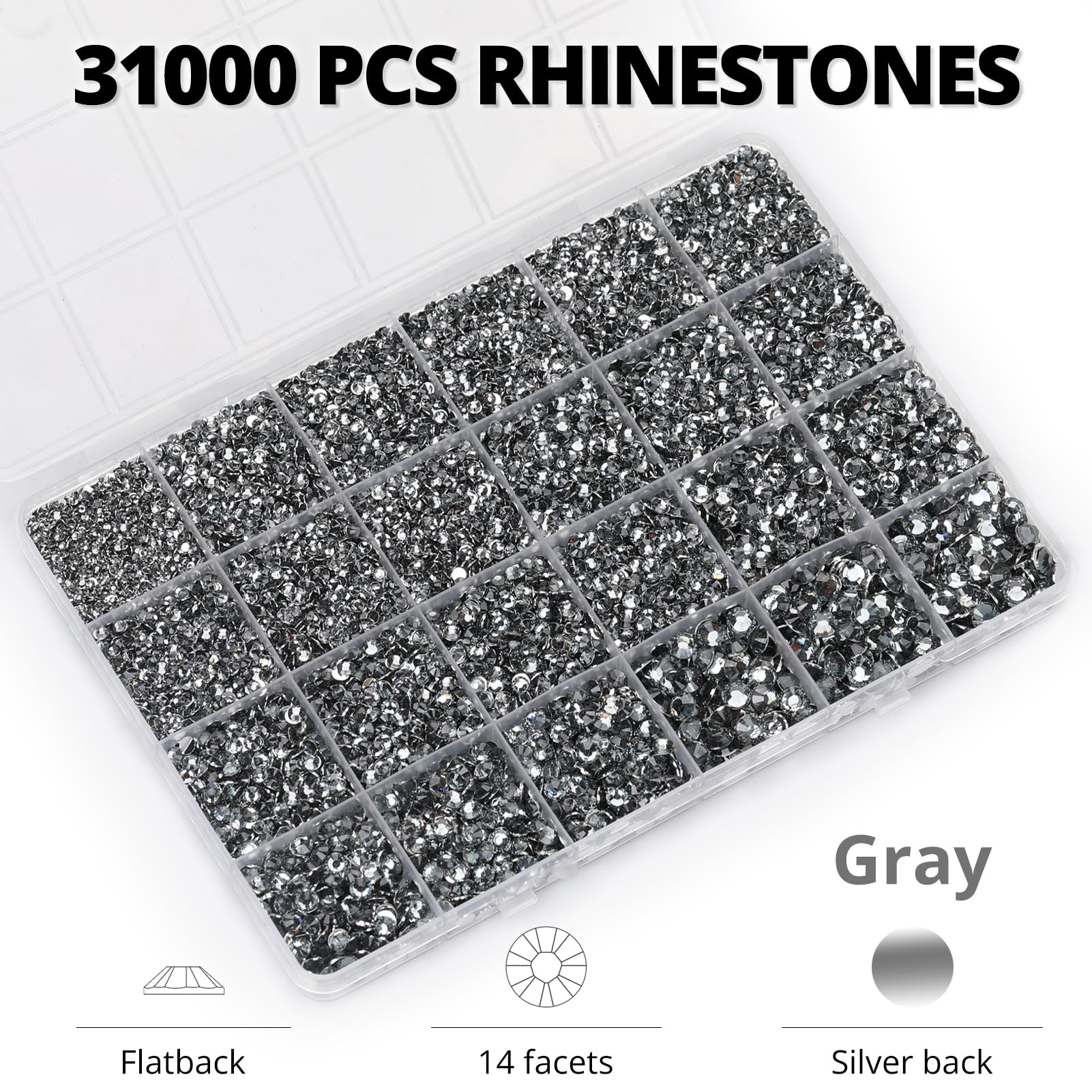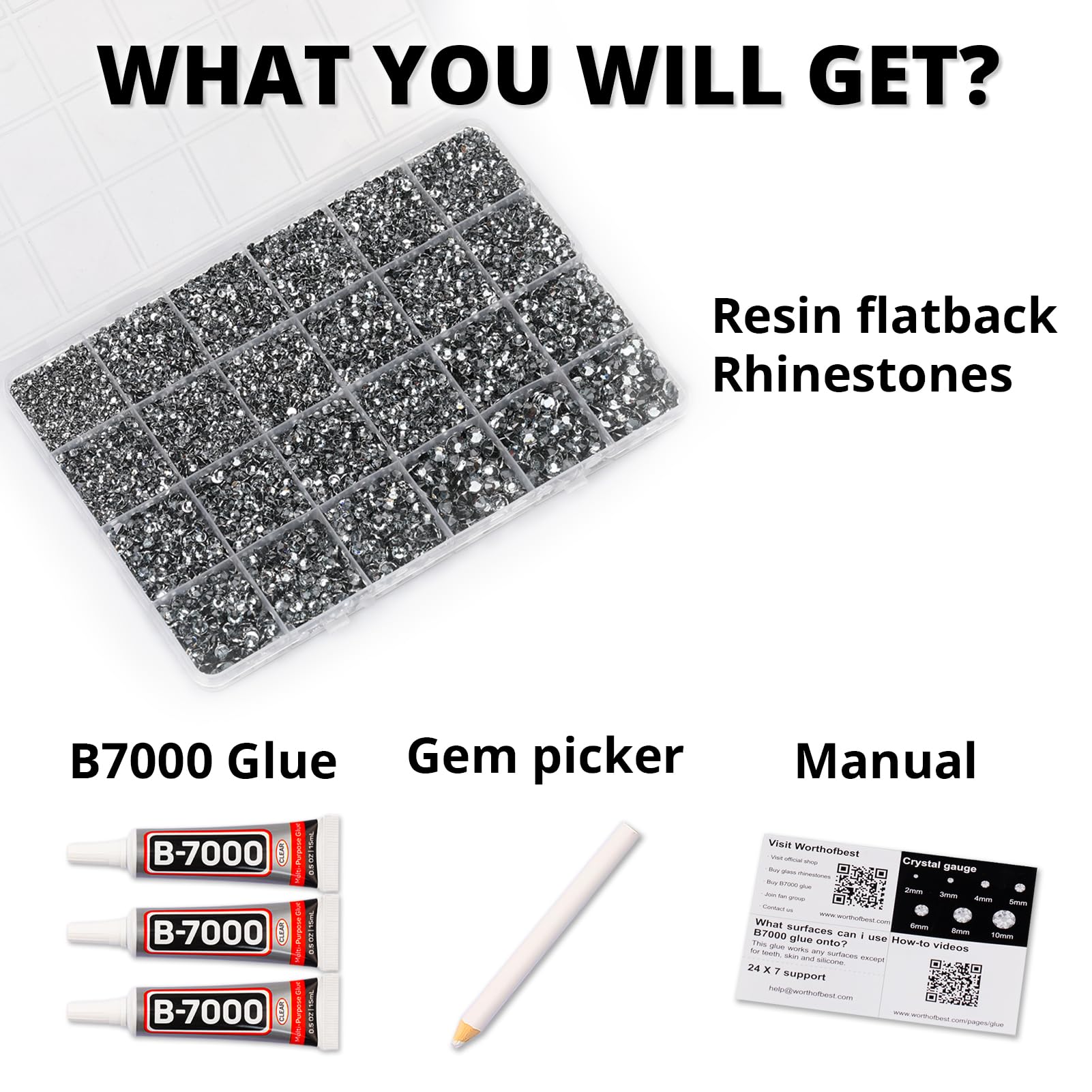 Package Content with Tool (pickup pen and manual) -- The bedazzler kit Package includes 1 grey rinestones set with 24 grids, approx 31000 pcs of 2-6mm bling-out resin rhinestones
