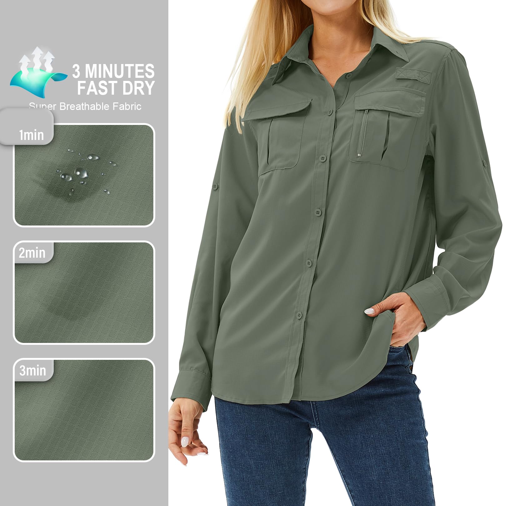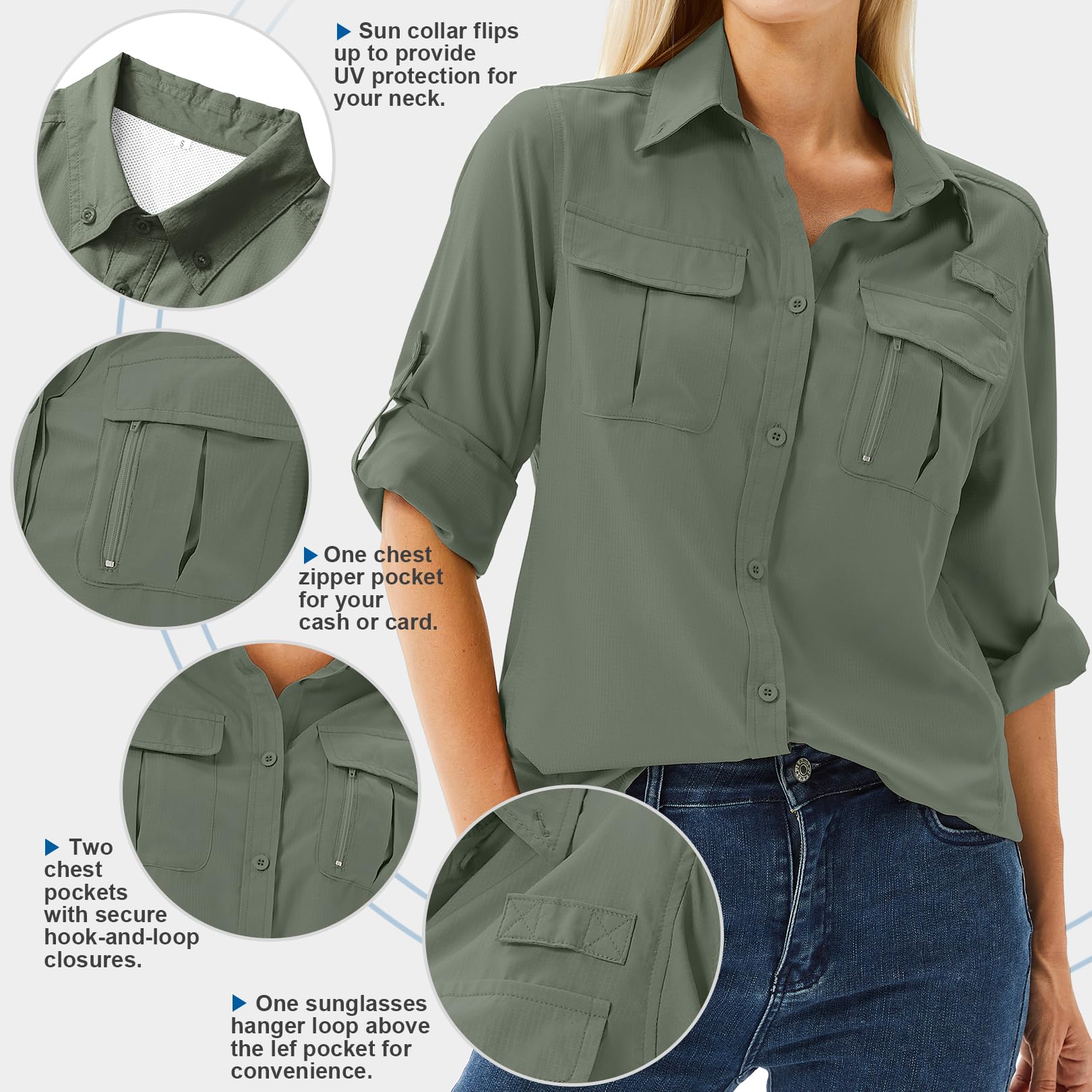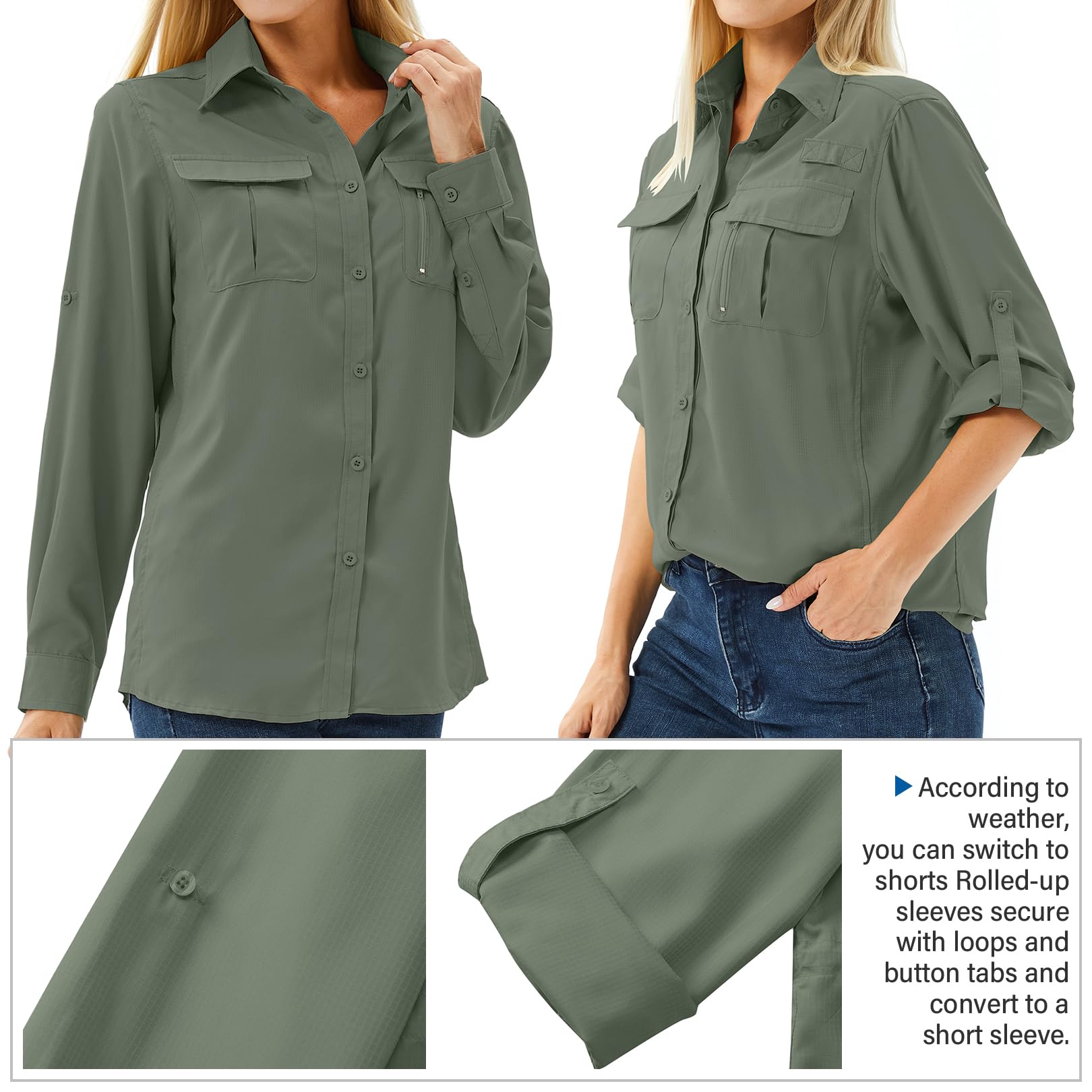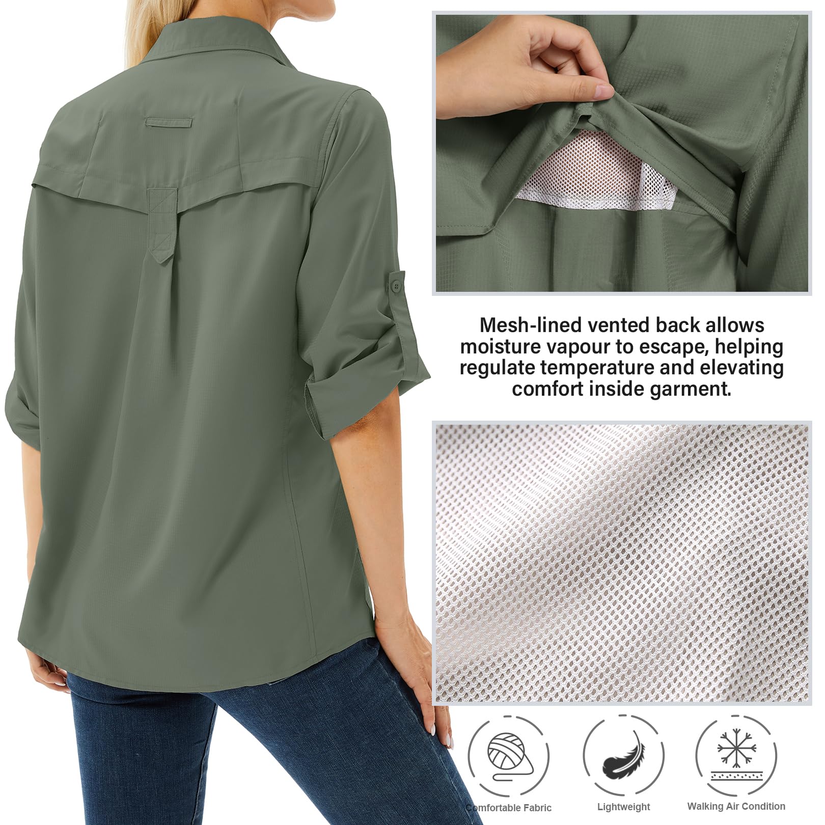 Long sleeve Hiking shirts:Women’s lightweight safari shirts features a mesh-lined vented back for breathability and comfort. Roll-up sleeves to convert long sleeves to short sleeves for hot days.