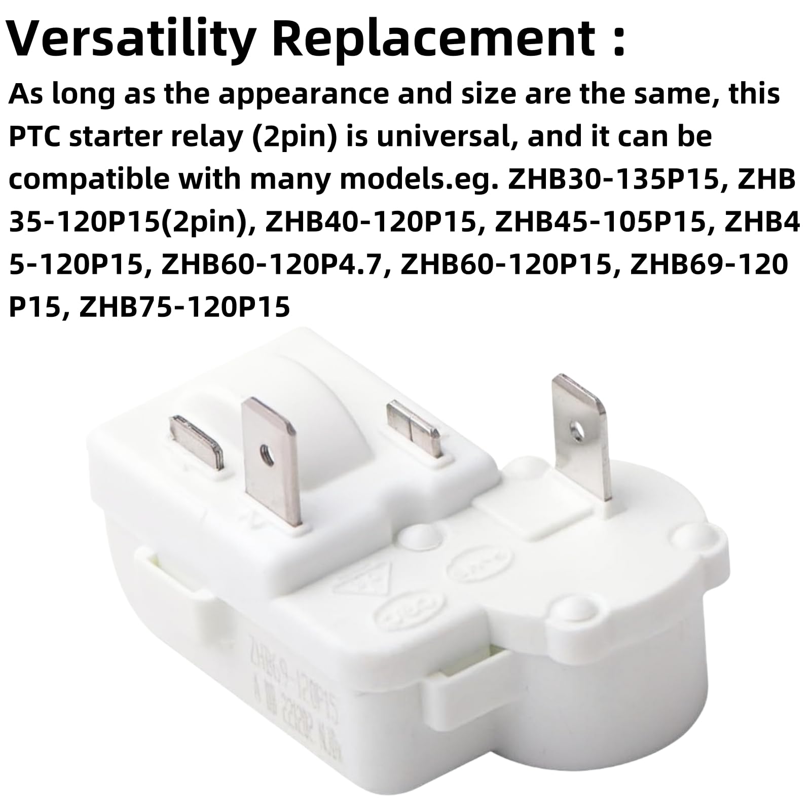 Versatility Replacement : as long as the appearance and size are the same, this PTC starter relay (2pin) is universal, and it can be compatible with many models.eg. ZHB30-135P15, ZHB35-120P15(2pin), ZHB40-120P15, ZHB45-105P15, ZHB45-120P15, ZHB60-120P4.7, ZHB60-120P15, ZHB69-120P15, ZHB75-120P15
