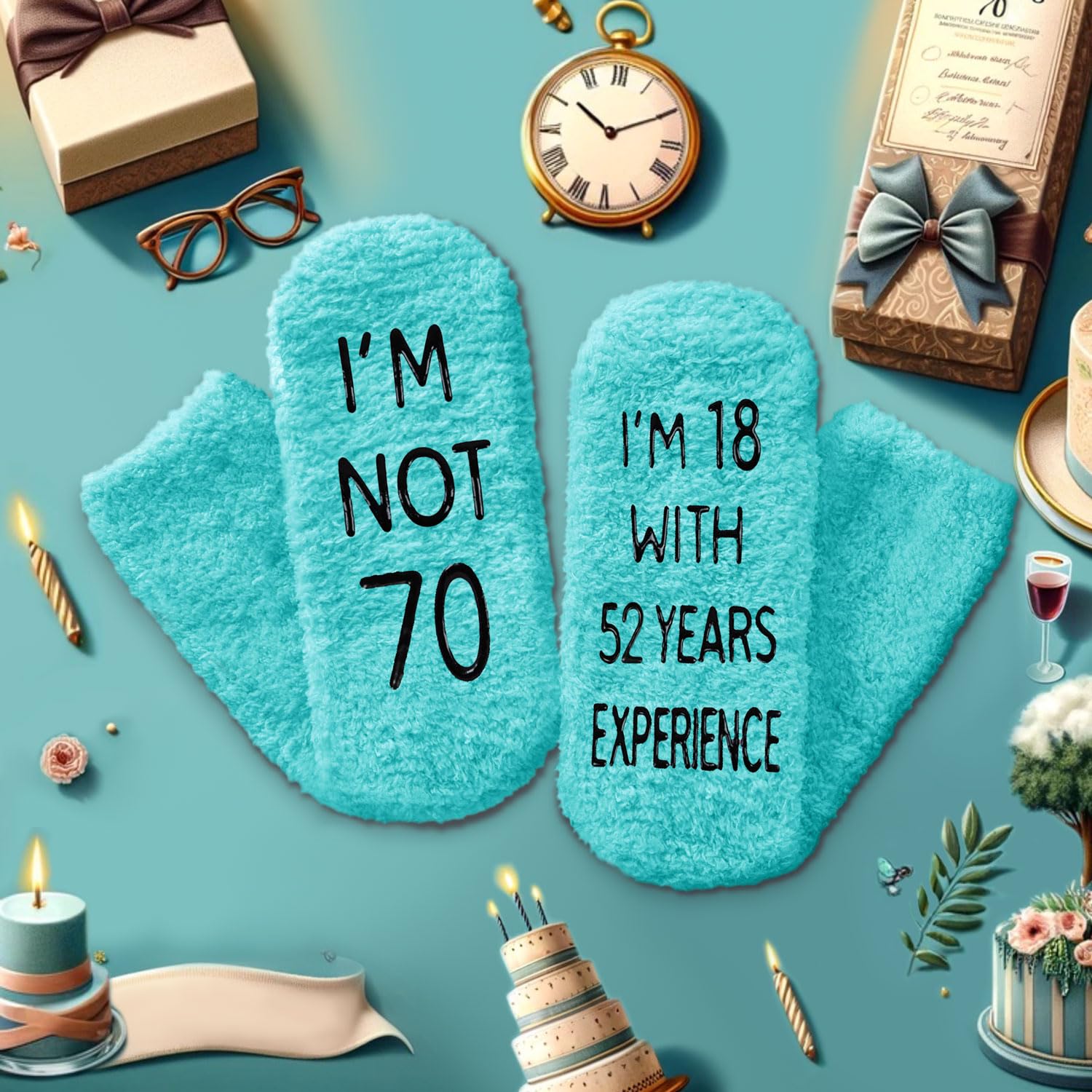 GIFTS FOR HER: Say it with socks - "I'M NOT 70, I'M 18 WITH 52 YEARS EXPERIENCE." These are suitable for any holiday gifts, such as Birthday gifts, White Elephant gifts, Christmas gifts, or Mother's Day gifts.