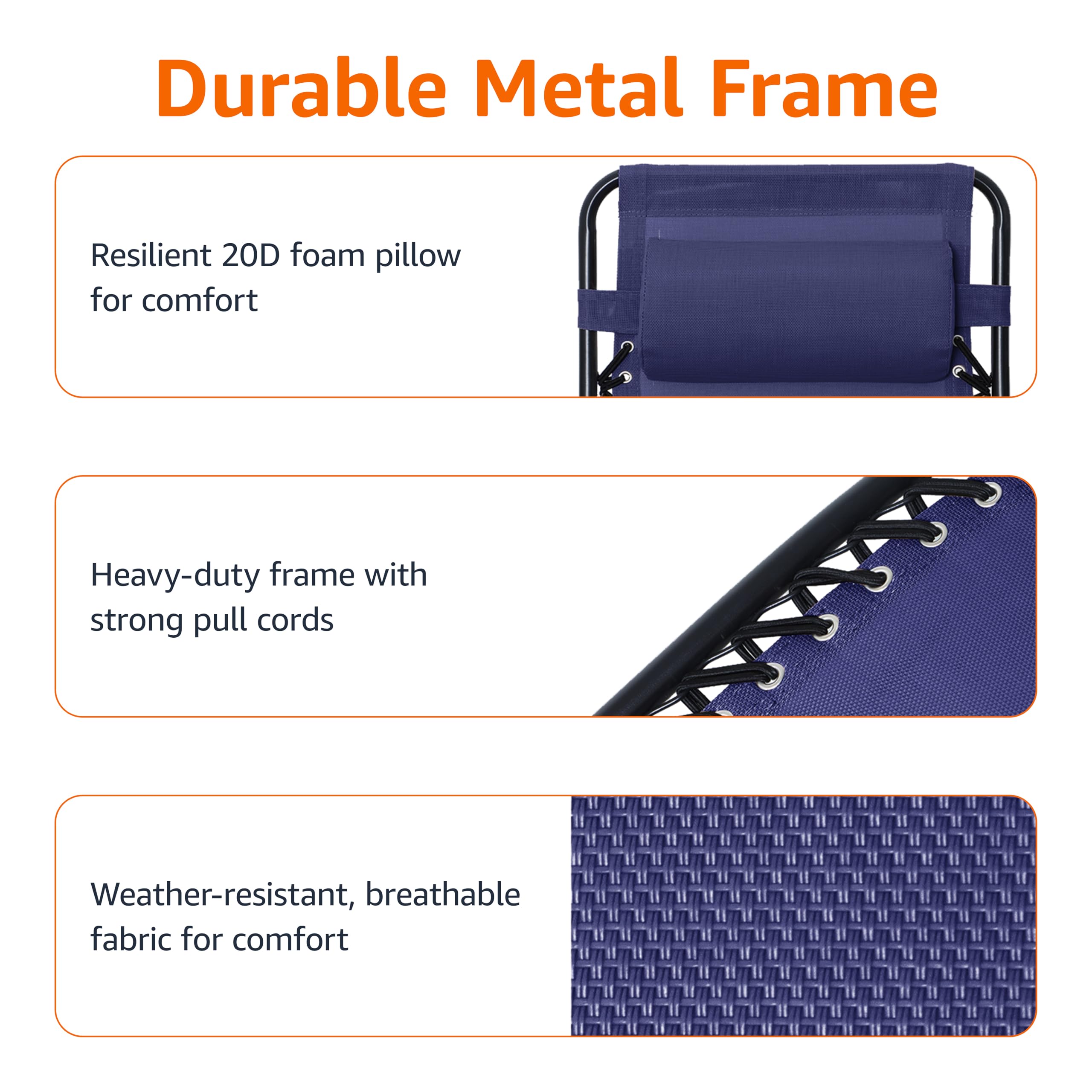 Product Description Amazon Basics Outdoor Textilene Adjustable Zero Gravity Folding Reclining Lounge Chair with Pillow, Navy Blue From the Manufacturer Amazon Basics