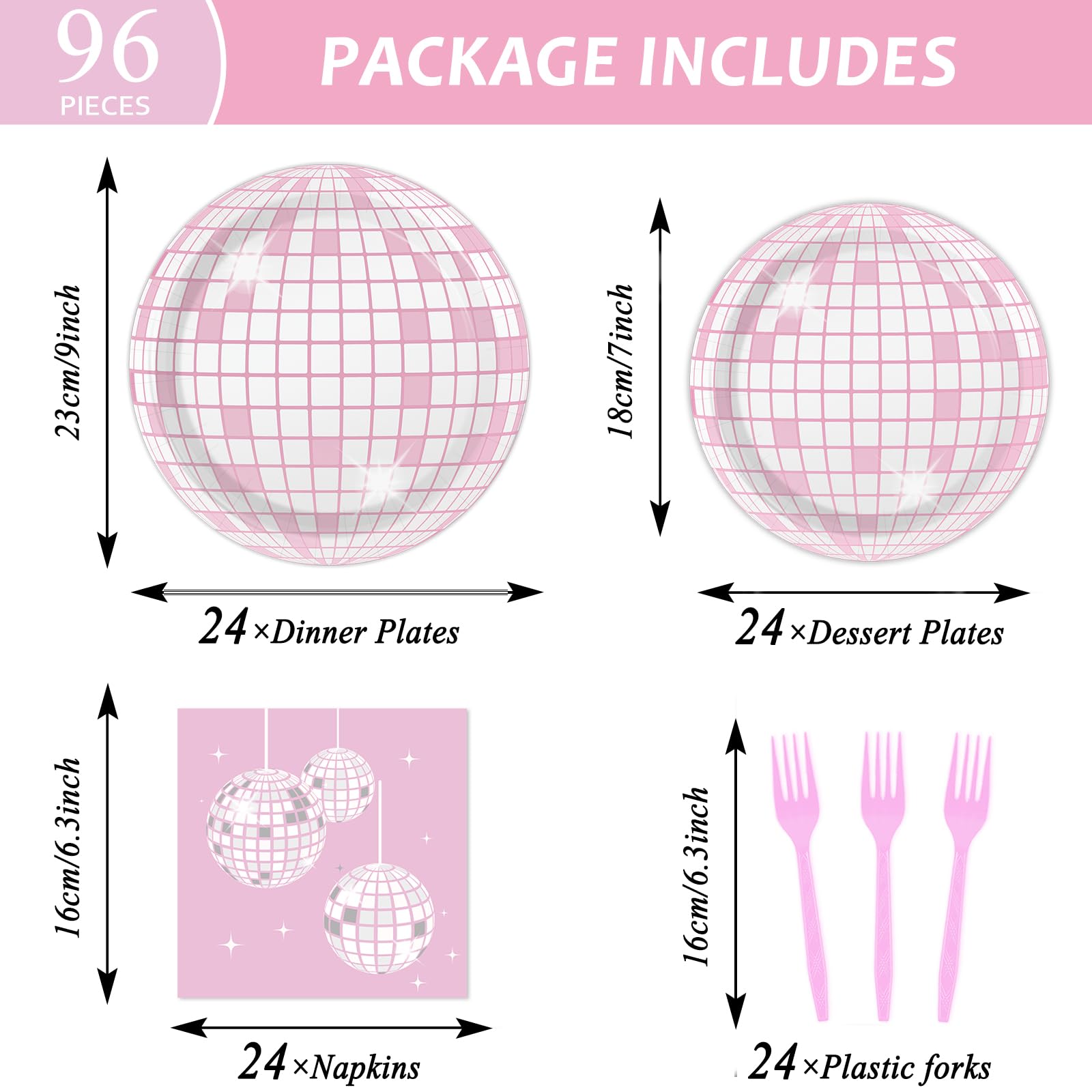 Serves 24 Guests:This pink disco party tableware supplies includes 24 paper plates (7"),24 paper plates (9"),24 napkins (6") and 24forks.The 70s pink theme party plates and napkins can serve for 24 guests.