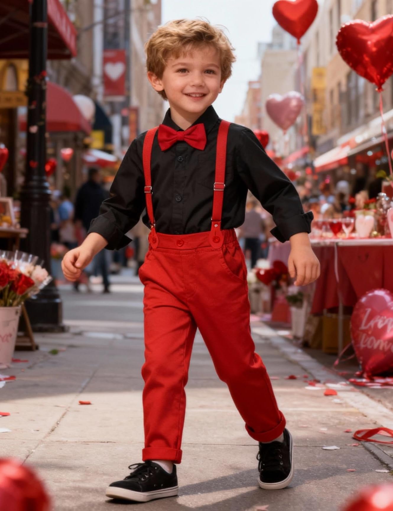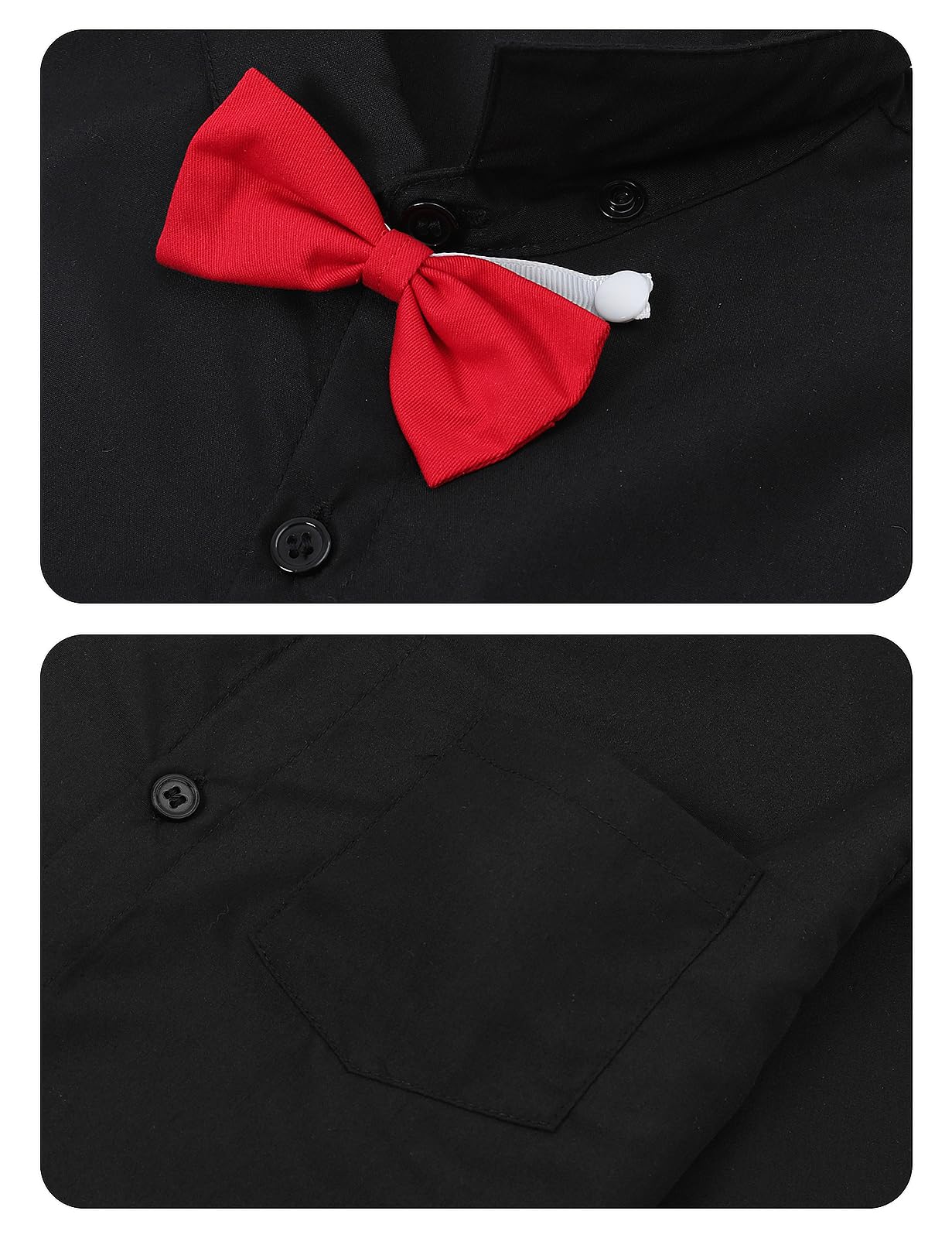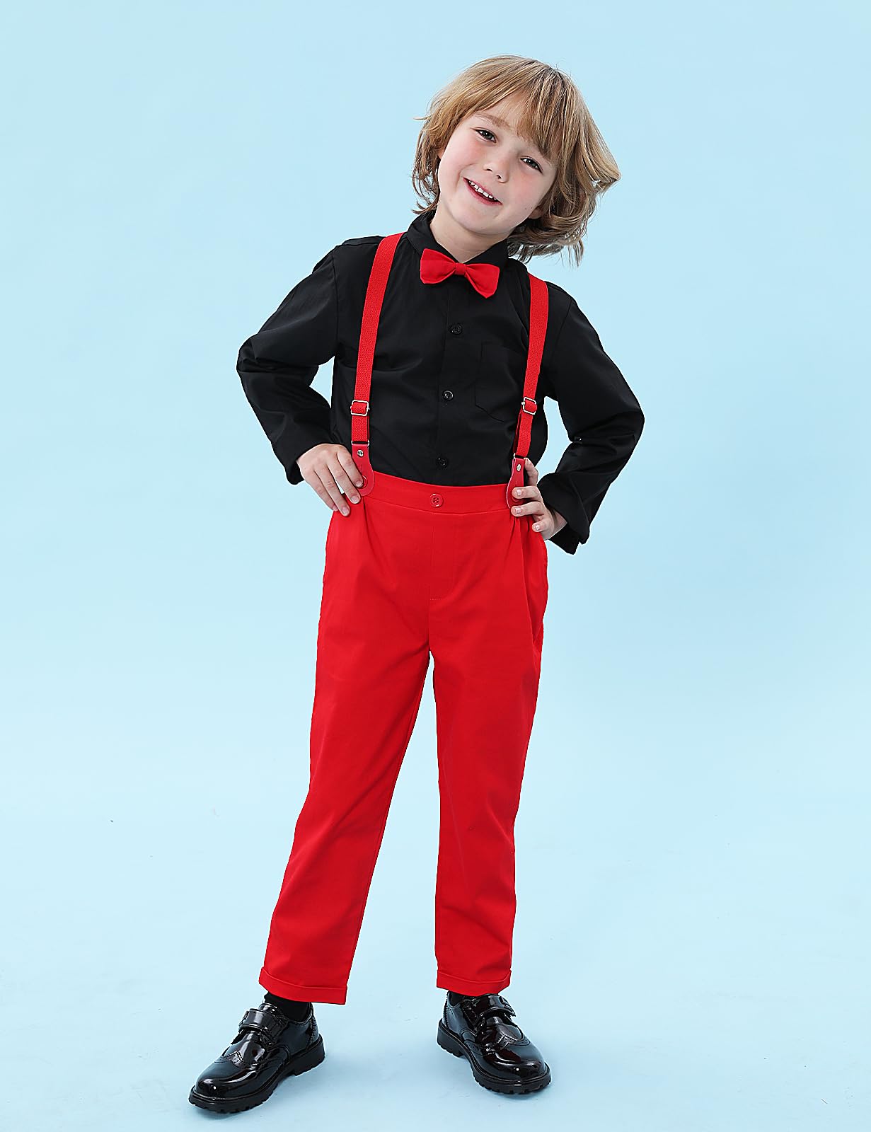 Toddler boy dress outfit consists of long sleeve dress shirt, elastic-waist pants, detachable bow tie and stretch suspender.