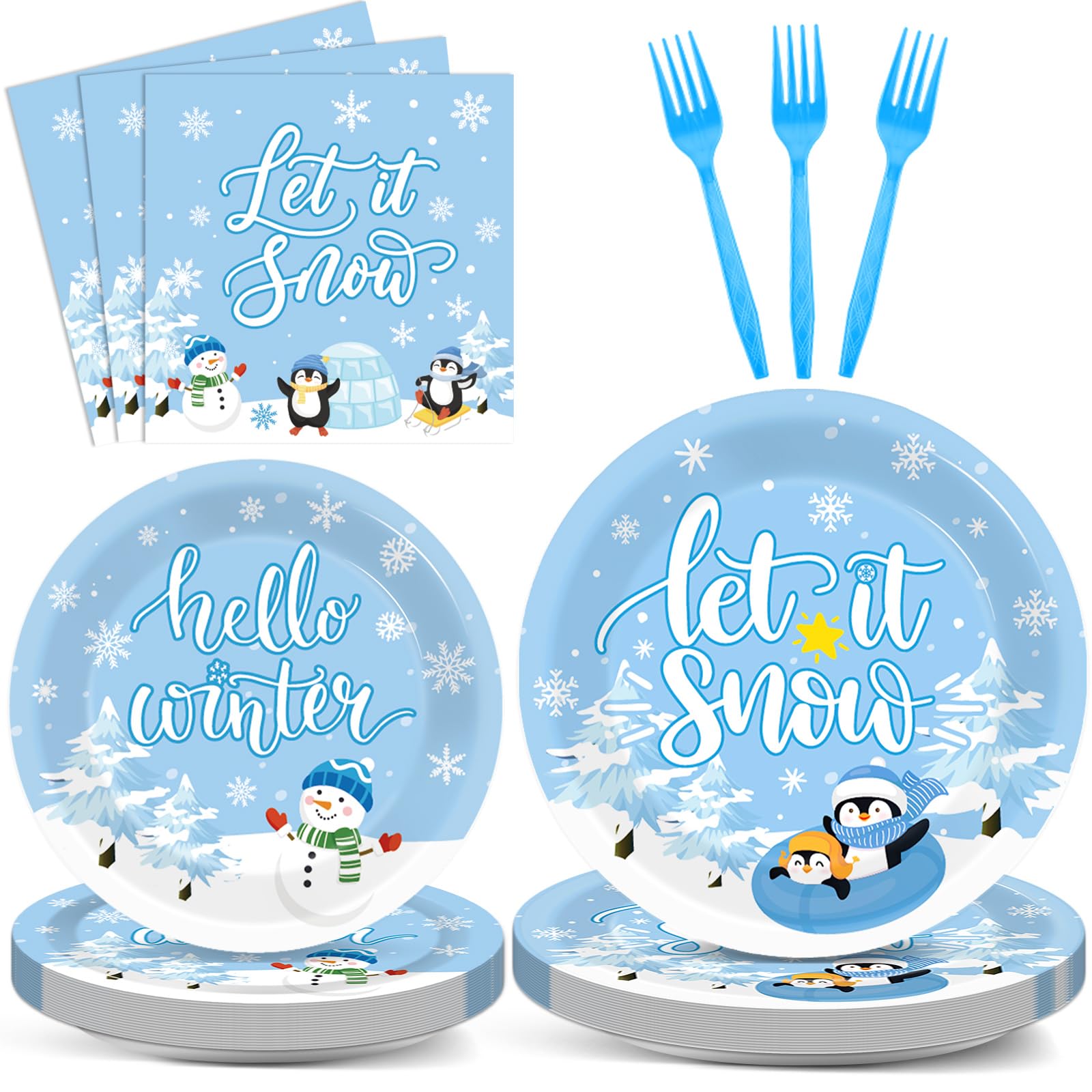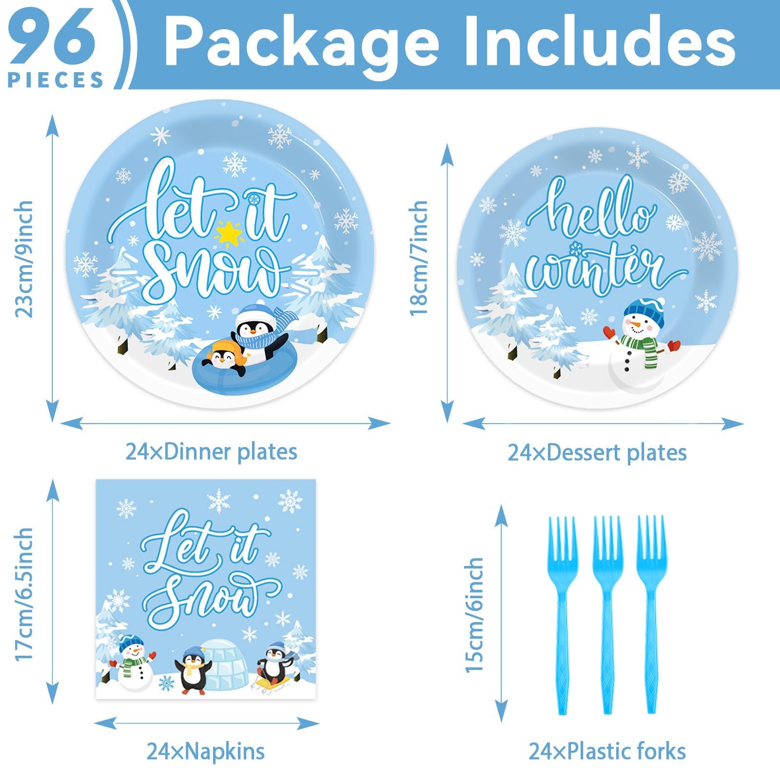 Super Value Pack:You will get 24 pieces Let It Snow party paper plates of 9"(22.5cm), 24 pieces Let It Snow party paper plates of 7"(17cm),24 pieces 2Ply Let It Snow party napkins of 4.9"(12.5cm),24 plastic forks of 6.5"(16.5cm) for enough dining for 24 guests.