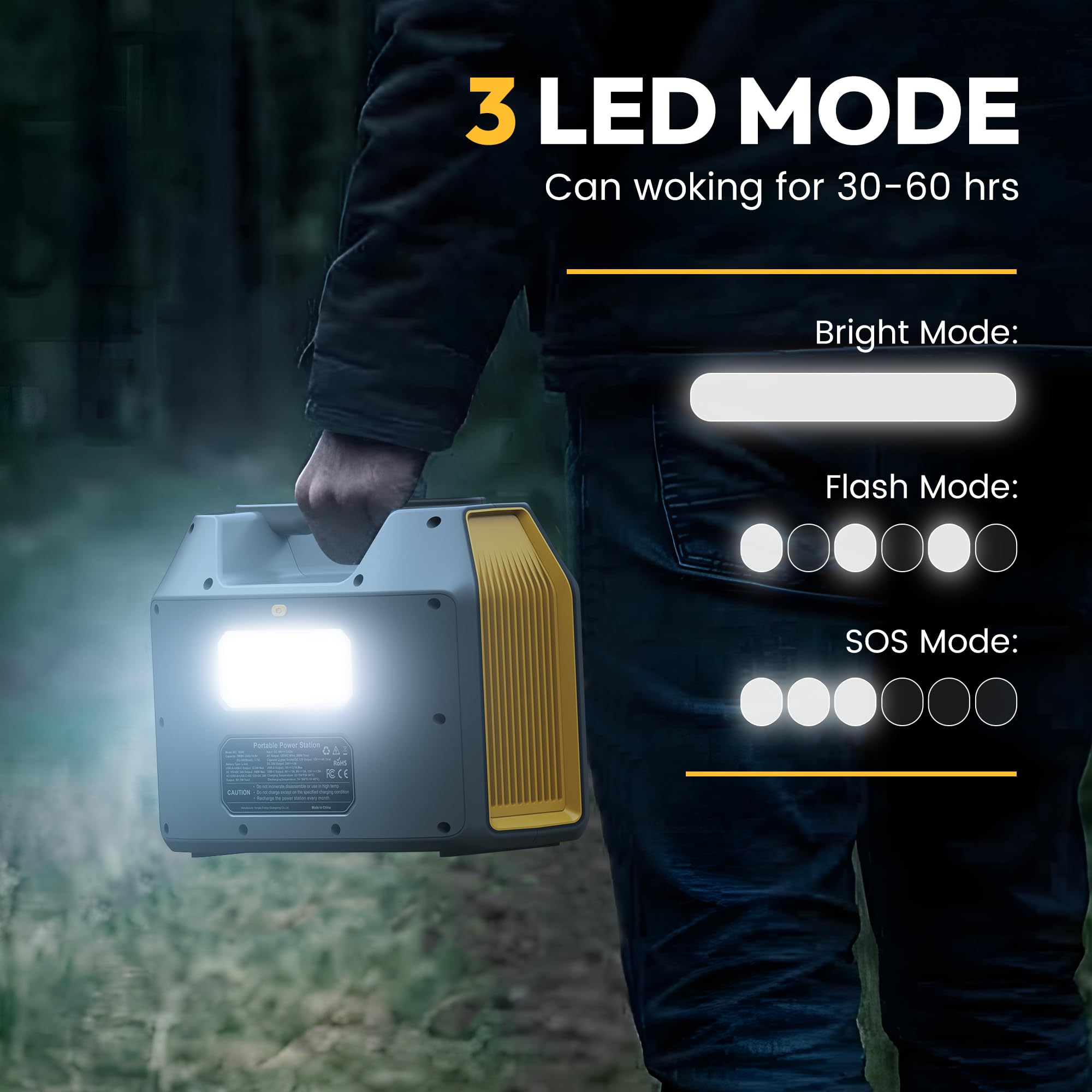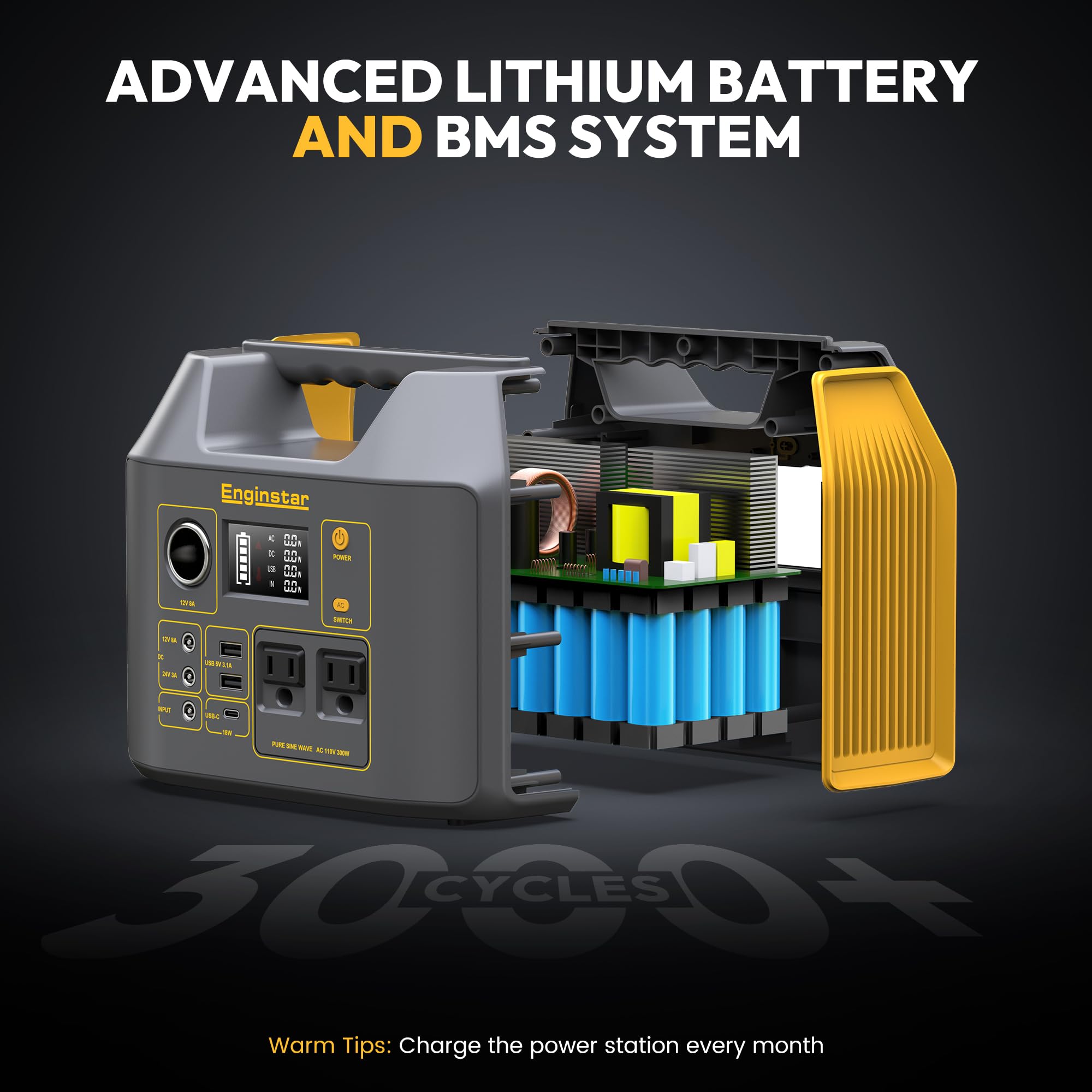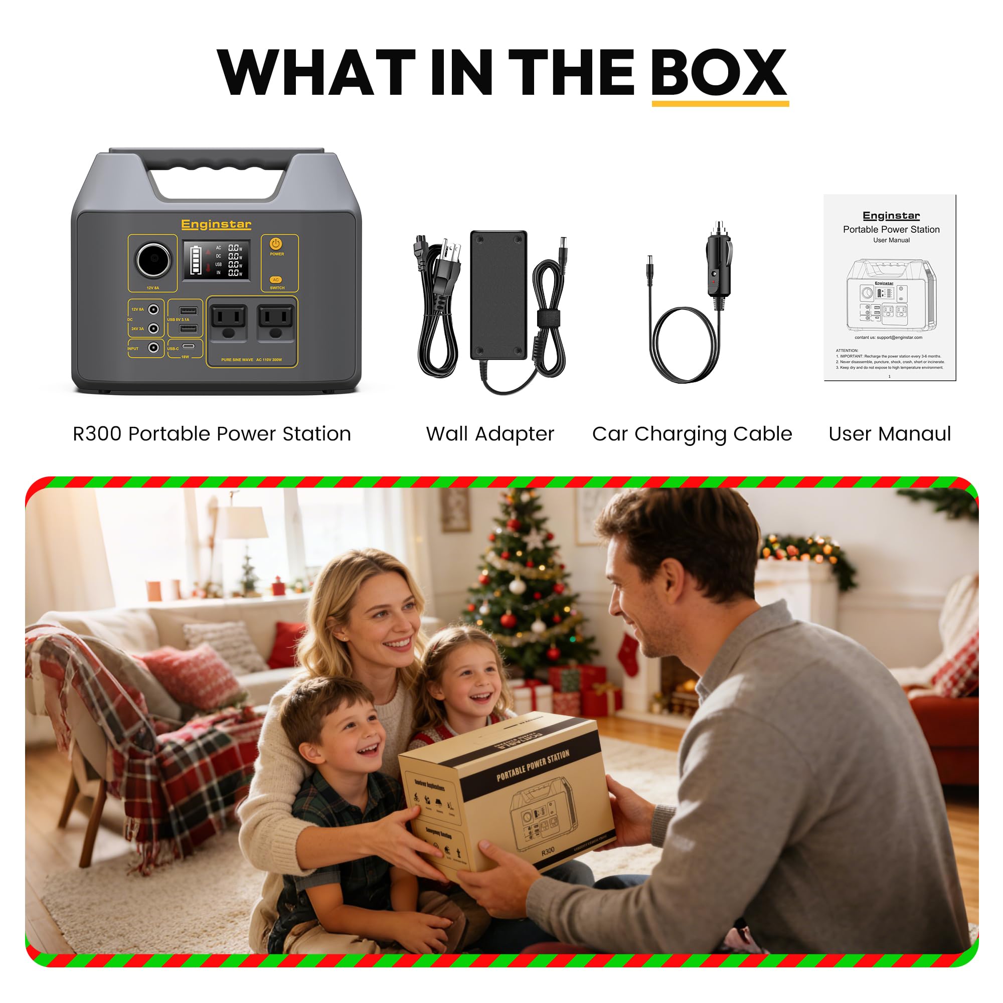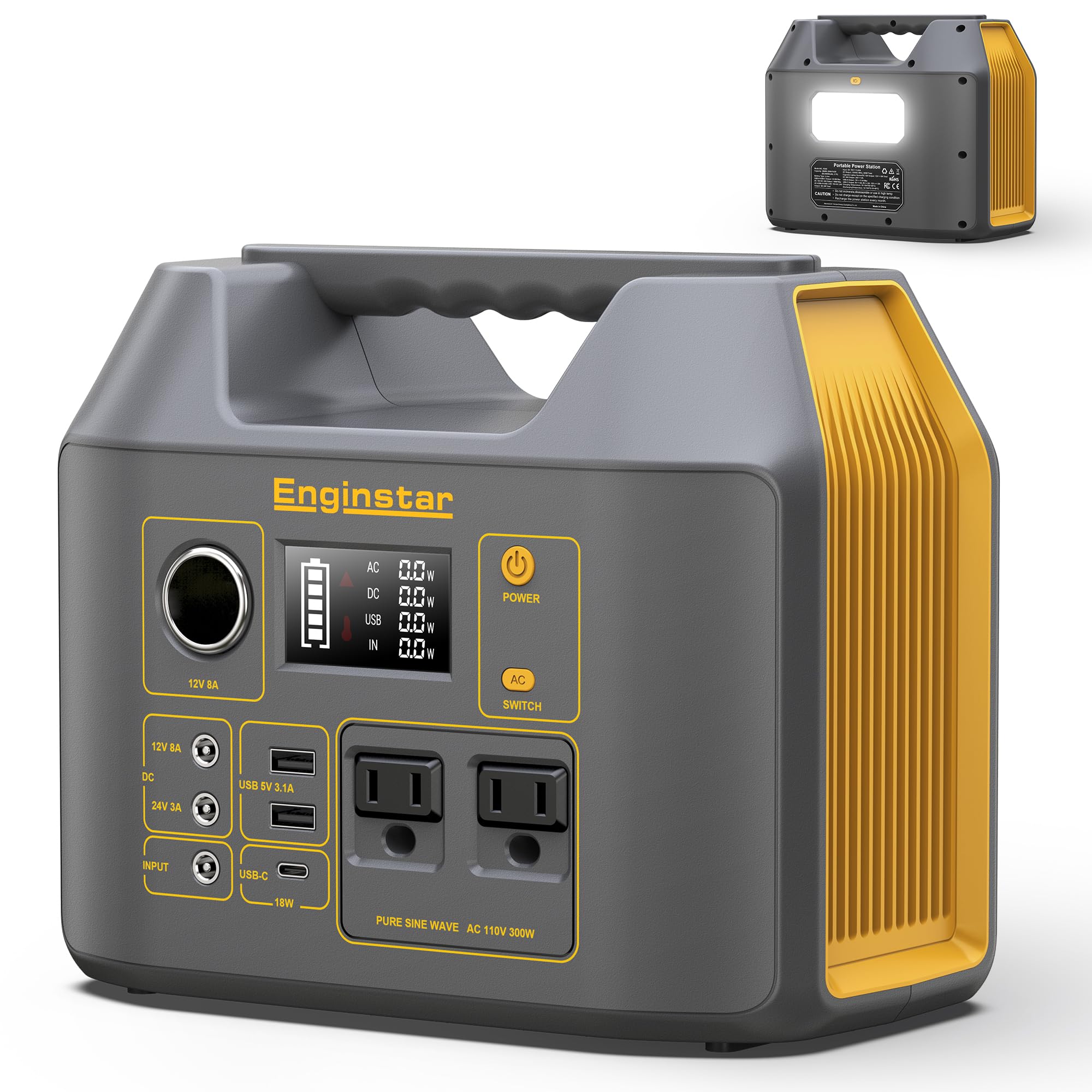 PORTABLE BUT POWERFUL: 9 x 5.5 x 7.5 inches body size, only 6.5lb, EnginStar 300W portable power station is every compact, built-in LED light and large LCD display, easy to read, EnginStar portable power station provides 296 watt-hours of power usage, sufficient to power for weekend camping trips, road trip, RV living, outdoor off-grid activities, can provide enough juice to charge your phones, laptop, camera, CPAP, drone and more