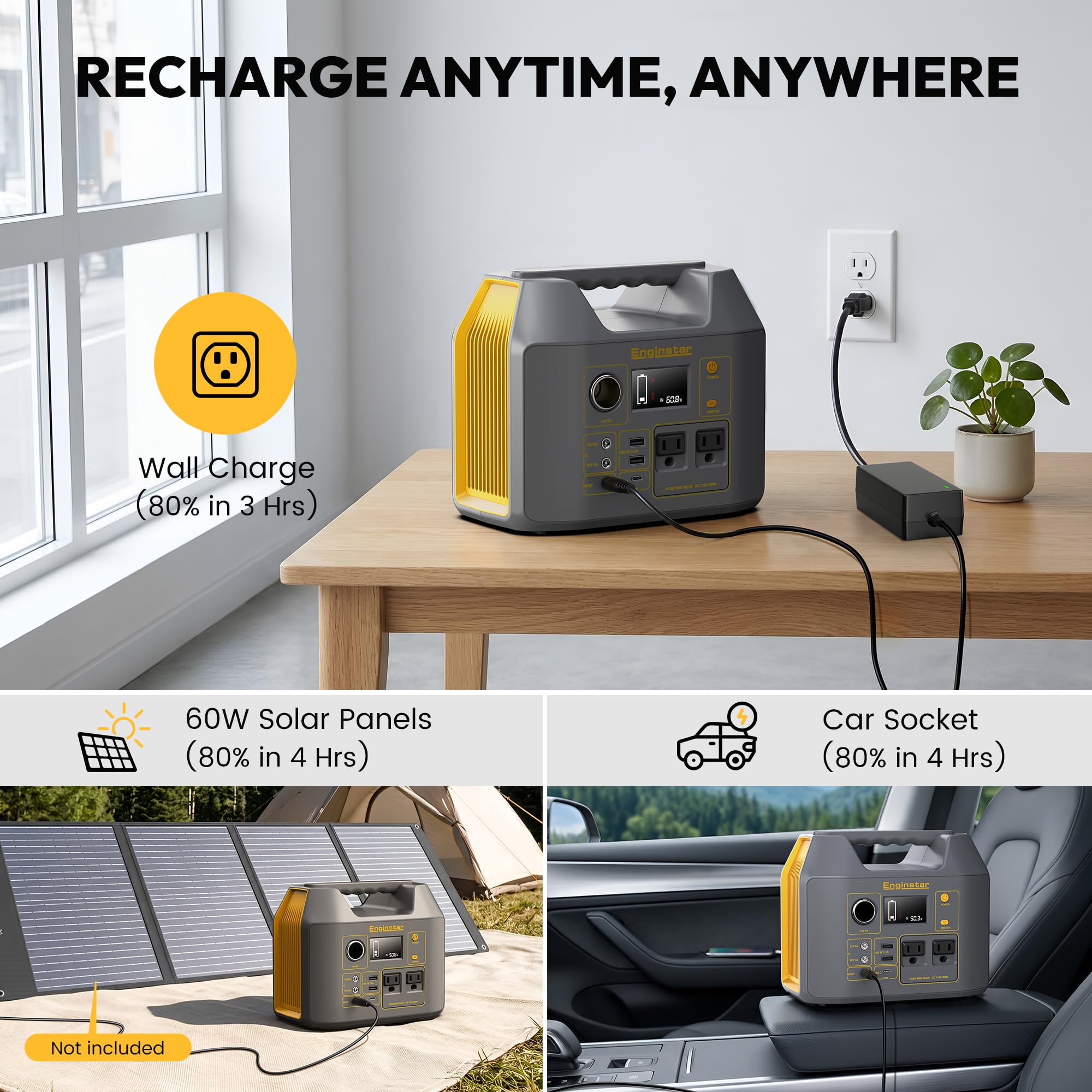 3 CHARGING WAYS POWER SUPPLY: EnginStar power bank with ac outlet can charge by wall charger at home (fully charge time about 7 hours); 300w solar powered generator, can be charged with solar panel (sold separately) in the sunny day field; EnginStar 300w camping generators can be charge by car charger on the go