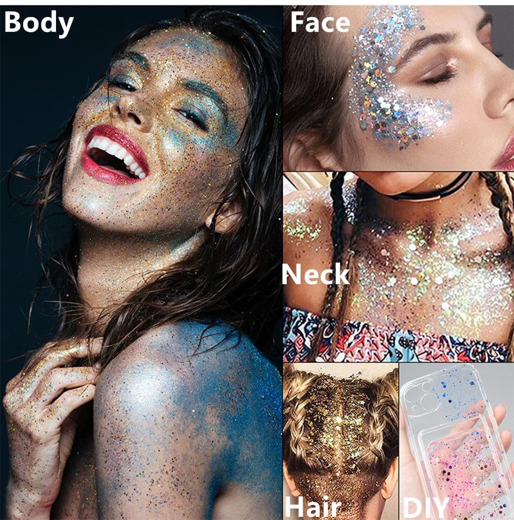 Hot Pink Body Glitter Face Paint Holographic Effect:1989 Singer Concerts Face Body Chunky Glitter Blends with plenty of different shapes and sizes of chunky and fine glitters in a gel base,great for a metallic coverage wtih a holographic effect.The mermaid sequin glitters have vibrant color,which shows up as an ultra-reflective and shiny sparking shimmer smear.