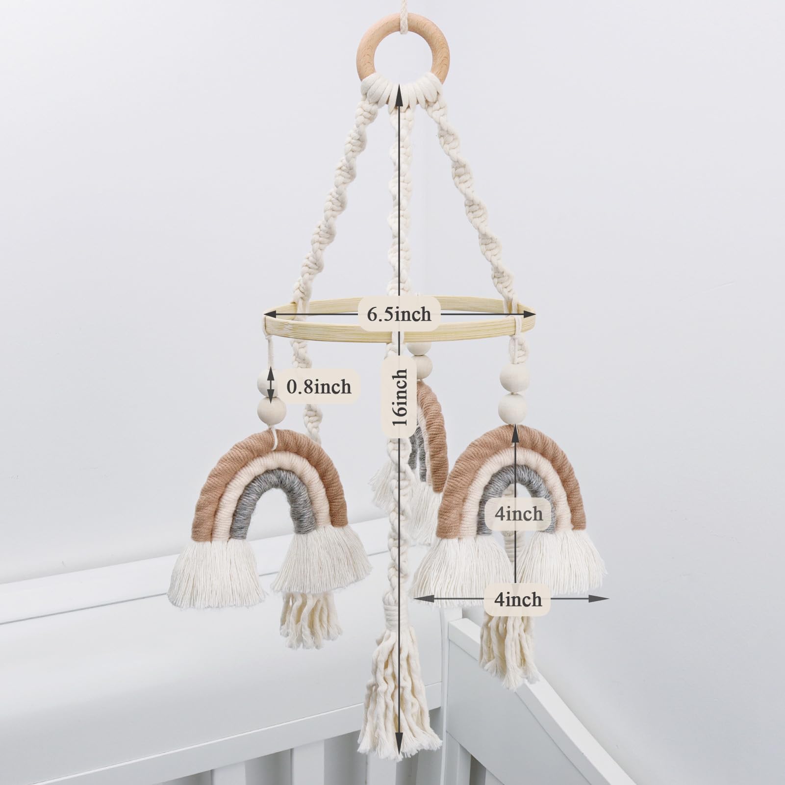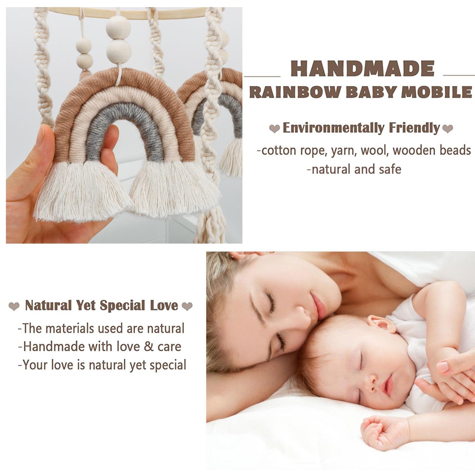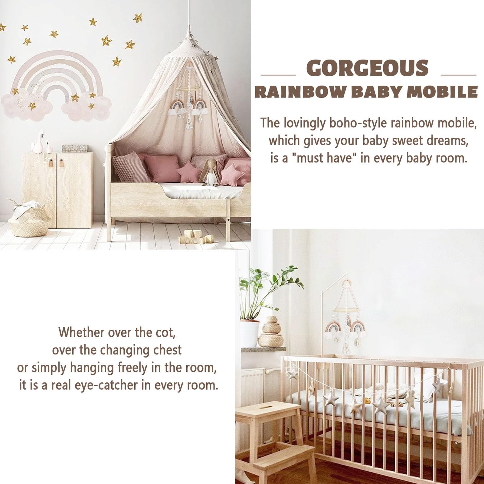 【NATURAL & SAFE】Macrame rainbow baby mobile is made of 100% environmentally friendly natural materials - macrame rope, yarn, wooden hoop, wooden bead, wooden ring, wire. Safe and soft. Give your rainbow baby your natural love. But please keep out of reach of small children at all times.