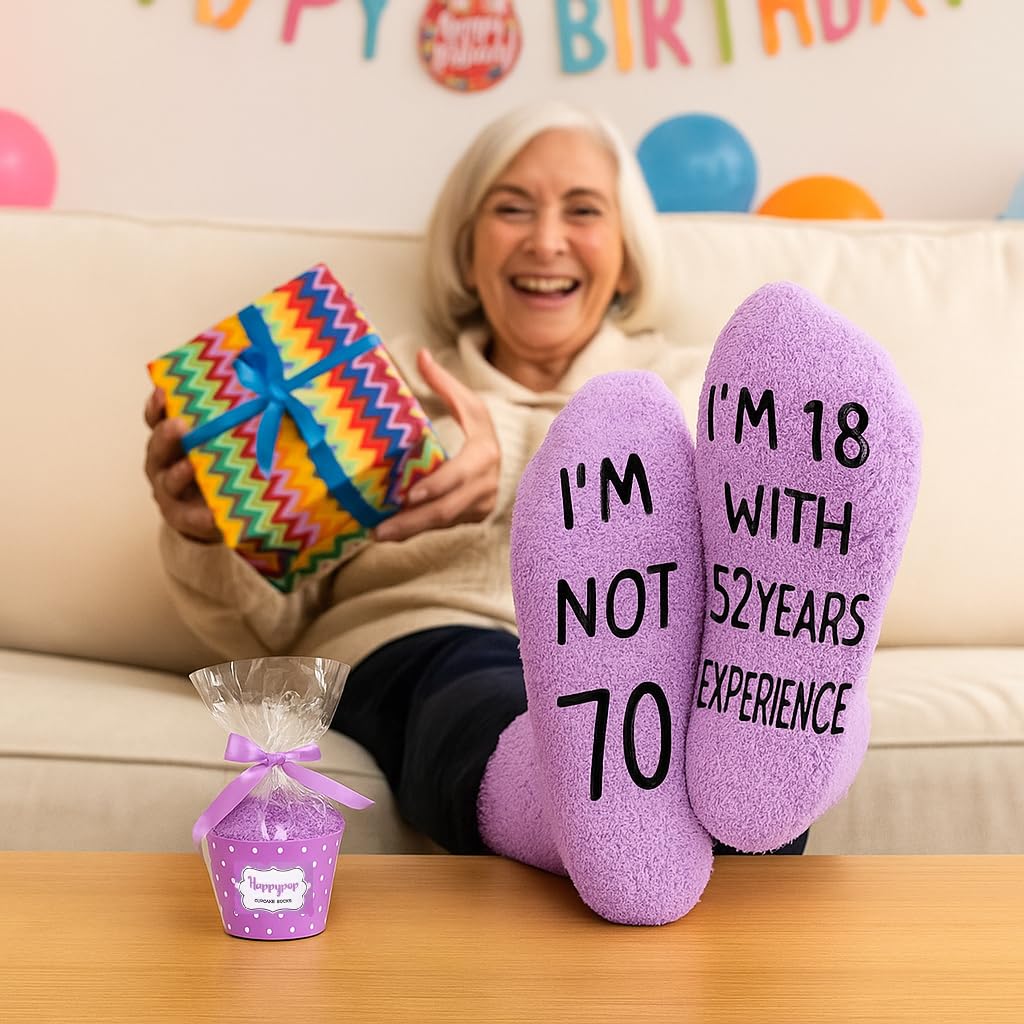 HAPPY 70 BIRTHDAY GIFTS FOR HER: Say it with socks - "I'M NOT 70, I'M 18 WITH 52 YEARS EXPERIENCE." These are suitable for any holiday gifts, such as Birthday gifts, Christmas gifts, White Elephant gifts, Mother's Day gifts.