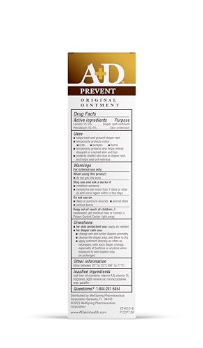 Use A&D Original Ointment at every diaper change to help prevent diaper rash. Especially helpful at bedtime when exposure to wet diapers may be prolonged. Ointment specially formulated with vitamins A and D as well as lanolin. Protects chafed skin or minor skin irritation due to diaper rash and helps seal out wetness.