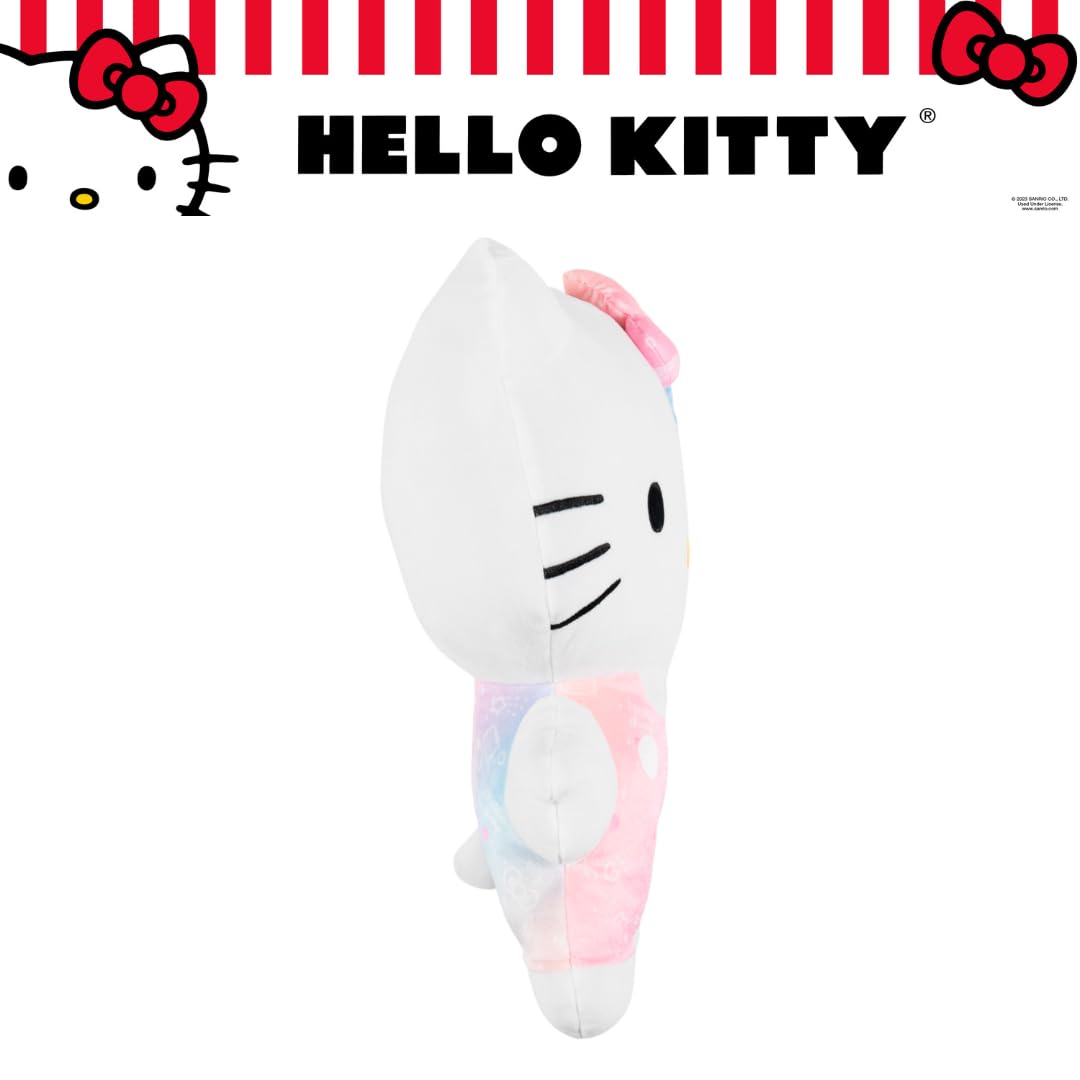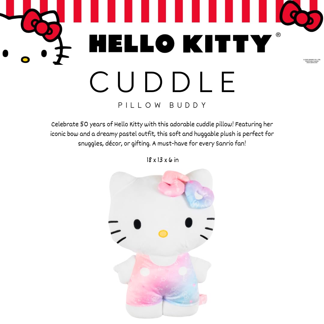 HELLO KITTY 50TH DESIGN: Celebrate 50 years of Hello Kitty with this adorable cuddle pillow! Featuring her iconic bow and a dreamy pastel outfit, this soft and huggable plush is perfect for snuggles, décor, or gifting. A must-have for every Sanrio fan!