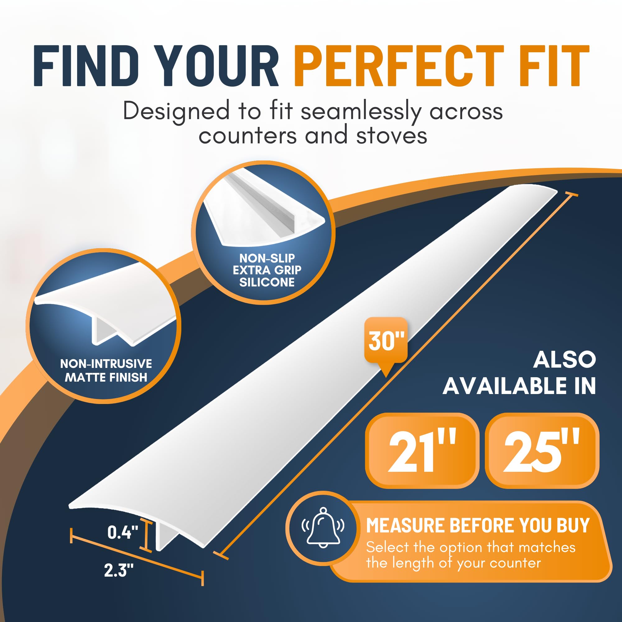 SIMPLE TO INSTALL: Our universal 30 inch stove gap guard sit perfectly in place on all stovetops. The non-slip flexible silicone conforms to your stove and counter surfaces and adapts to any uneven spaces. Easily customize to your stove by cutting to size using scissors