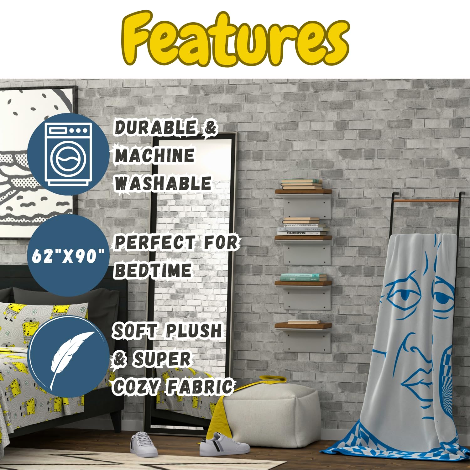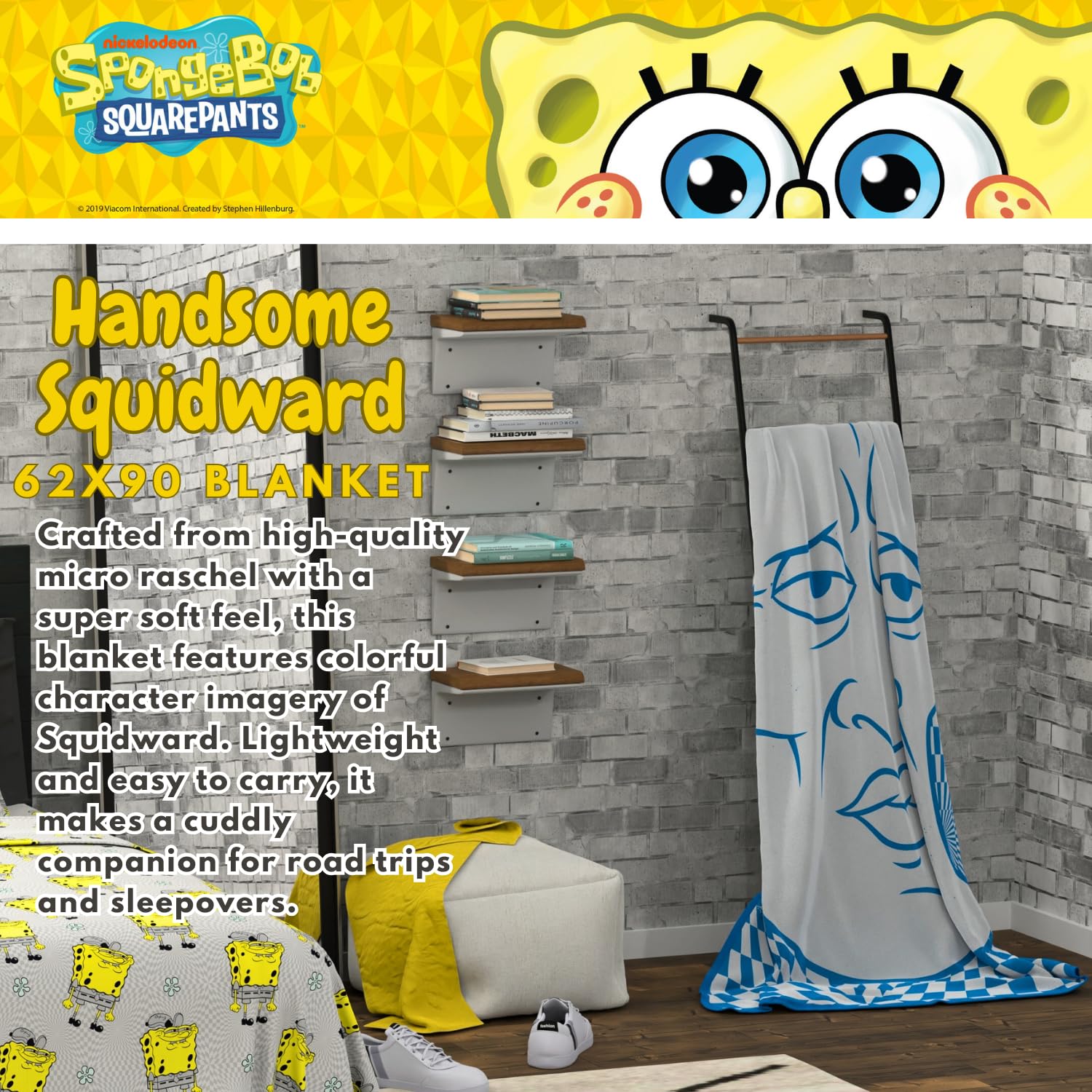 SPONGEBOB SQUAREPANTS DESIGN: This plush throw features a vibrant, animated design, graphics of "Handsome Squidward" against a warped checked background from the classic cartoon "SpongeBob SquarePants."