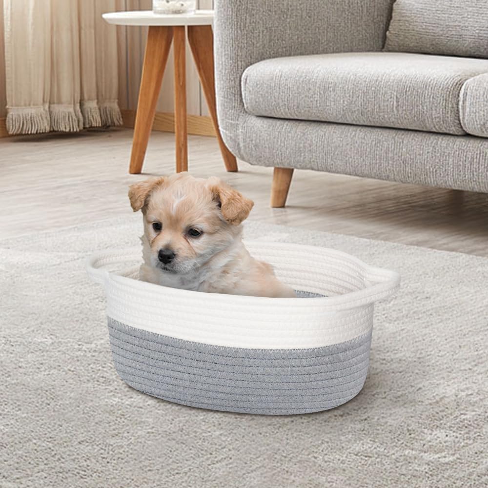 HONCESTA Small Dog Toy Basket, Woven Cotton Rope Storage Box for Cat Dog, Pet Baby Nursery Organizer, Empty Baskets for Gifts, Wicker Basket with Handles, Cute Shelf Bin for Decor, 12"x 8"x 5", Gray