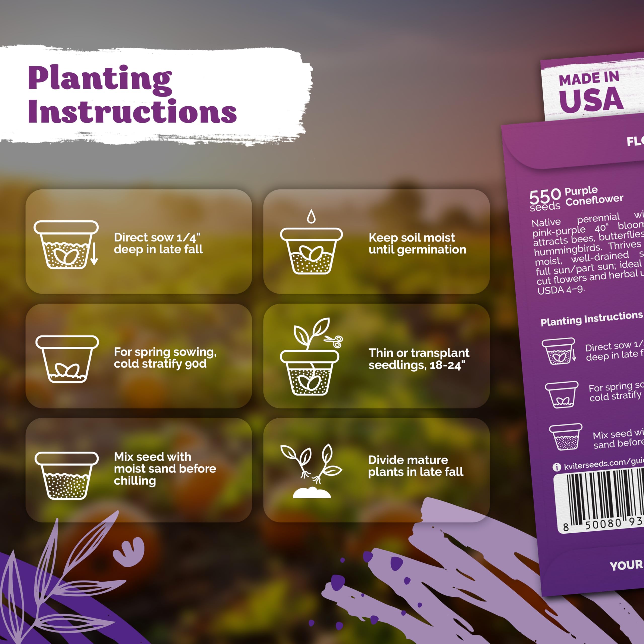 Medicinal Perennial Growth: Purple coneflower seeds perennial develop into long-living coneflower plants live. Widely grown as echinacea herb for immune support and these wildflower seeds have ornamental garden value.