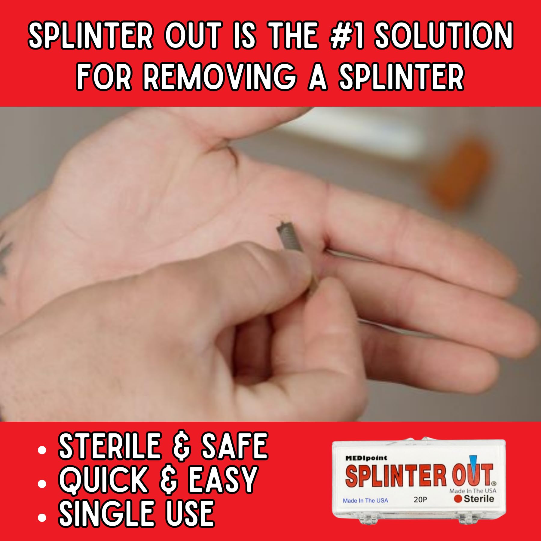Sterile: Each individually wrapped Splinter Out is Sterile, made with high-grade stainless steel. Be splinter-free safely in seconds. FAST, SIMPLE and SAFE.