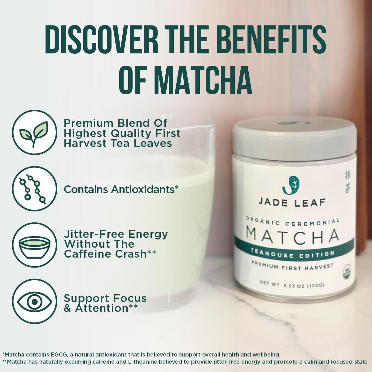 JADE LEAF MATCHA: Jade Leaf is proudly the #1 Matcha brand in the US*. We source our matcha directly from family-owned partner farms across the Uji and Kagoshima regions. Our tea masters fuse traditional and modern techniques to cultivate leaves brimming with flavor and nutrients, creating well rounded flavor blends, not found anywhere else.