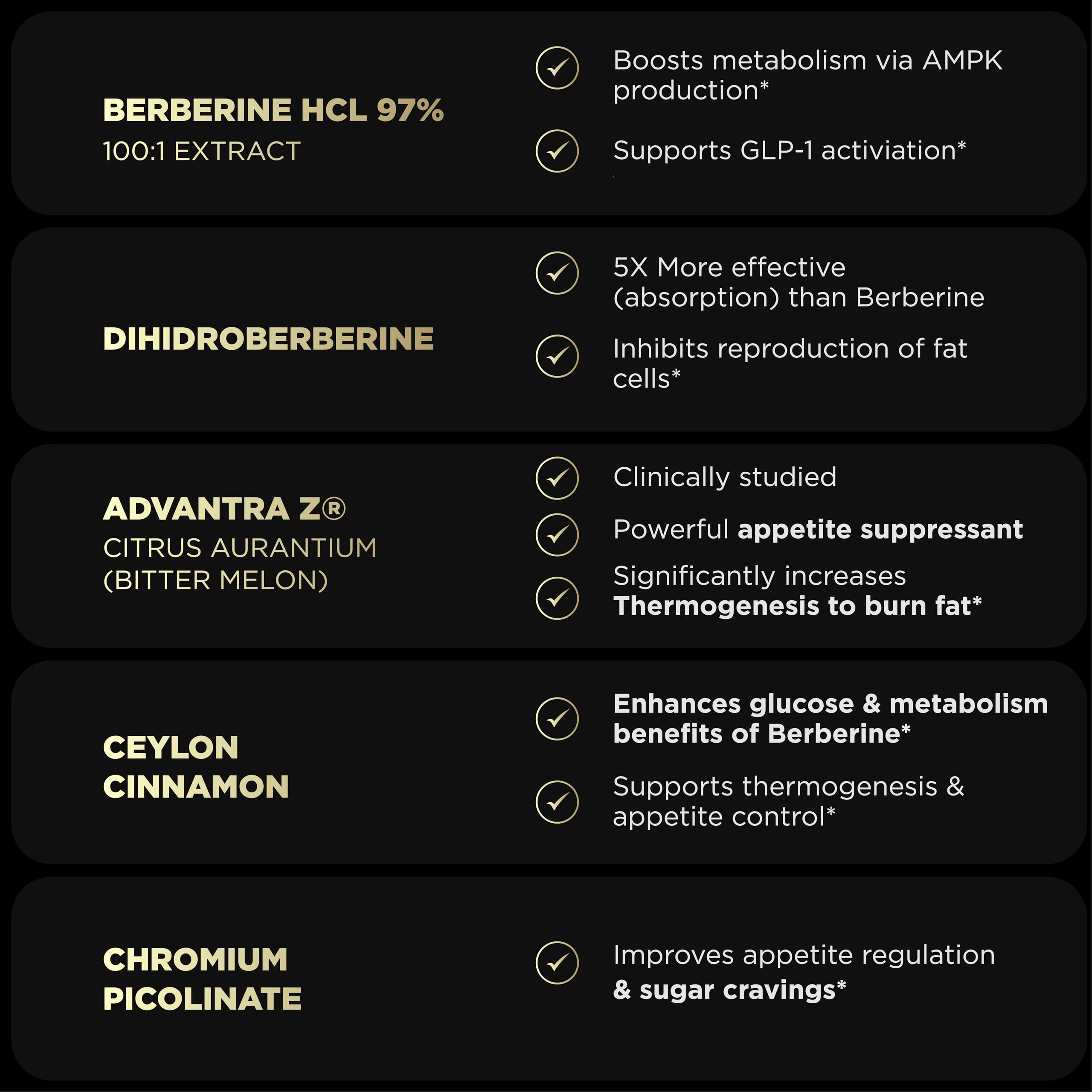 Advanced GLP-1 Weight Loss Support Berberine Supplement:* Go beyond average berberine supplements with ELMNT 100x concentrated Berberine Supplement enhanced with Dihydroberberine and Ceylon Cinnamon, meticulously formulated with a comprehensive GLP1 activating formula for superior efficacy for promoting GLP1 for weight loss as a powerful metabolism booster, appetite suppressant & blood sugar support by improving glucose levels for both women & men.* 141,500MG ULTRA CONCENTRATED BERBERINE + DIHYDROBERBERINE GLP-1 WEIGHT LOSS FORMULA: 100:1 Berberine HCL 97% | 1,417mg (100:1 extract equivalent to 141,700mg pure barberry powder) Dihydroberberine | 83mg (5x higher absorption than standard berberine powder) Advantra Z Bitter Melon (Citrus Aurantium) Extract | 200mg (std. to 10% Synephrine) Green Tea Extract | 180mg (50% EGCG) Ceylon Cinnamon | 50mg VegiSurge Natural Caffeine (from green tea extract) | 20mg Chromium Picolinate | 1000mcg (Also searched as: glp1 weight loss patches, slim patch for weight loss for women, berberine 500mg 1500mg, weight loss pills for women, glp-1 supplement weight loss, berberine weight loss, glp activate, glp1 supplements weight loss women, chromium picolinate 1000mcg for weight loss, berberina para bajar de peso, appetite suppressant glp1, met formina natural 1000mg ni una dieta mas, gpl-1 weight loss supplement, liposomal berberine 1000mg, glp1 booster, berberina 1,500mg para reducir el azucar en la sangre, sema glp ozem pills natural alternative, best berberine 1200 mg capsules drops, barberry supplements, dihydroberberine 1500mg, dehydro berberine supplement, bitter orange extract synephrine supplement, bitter melon capsules)