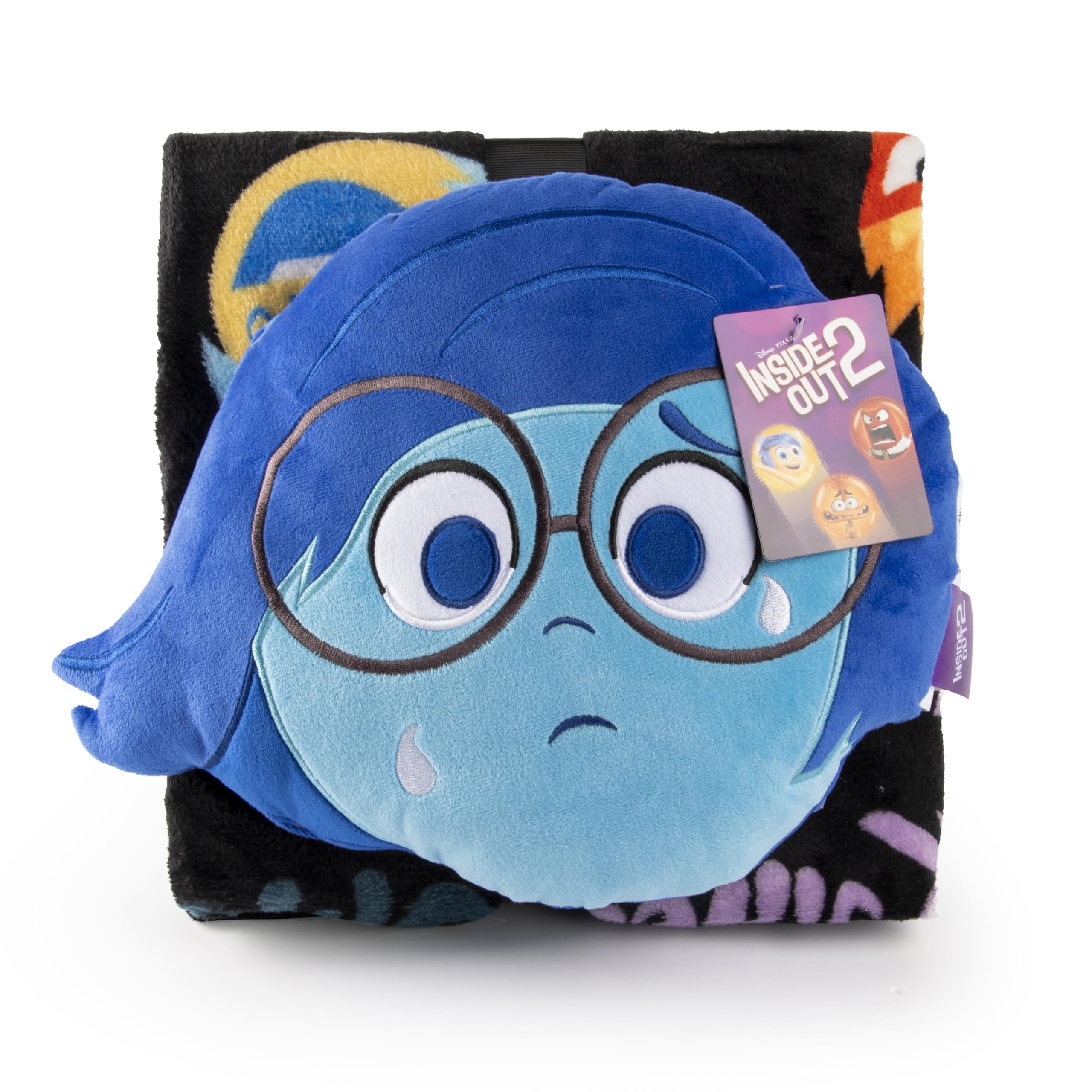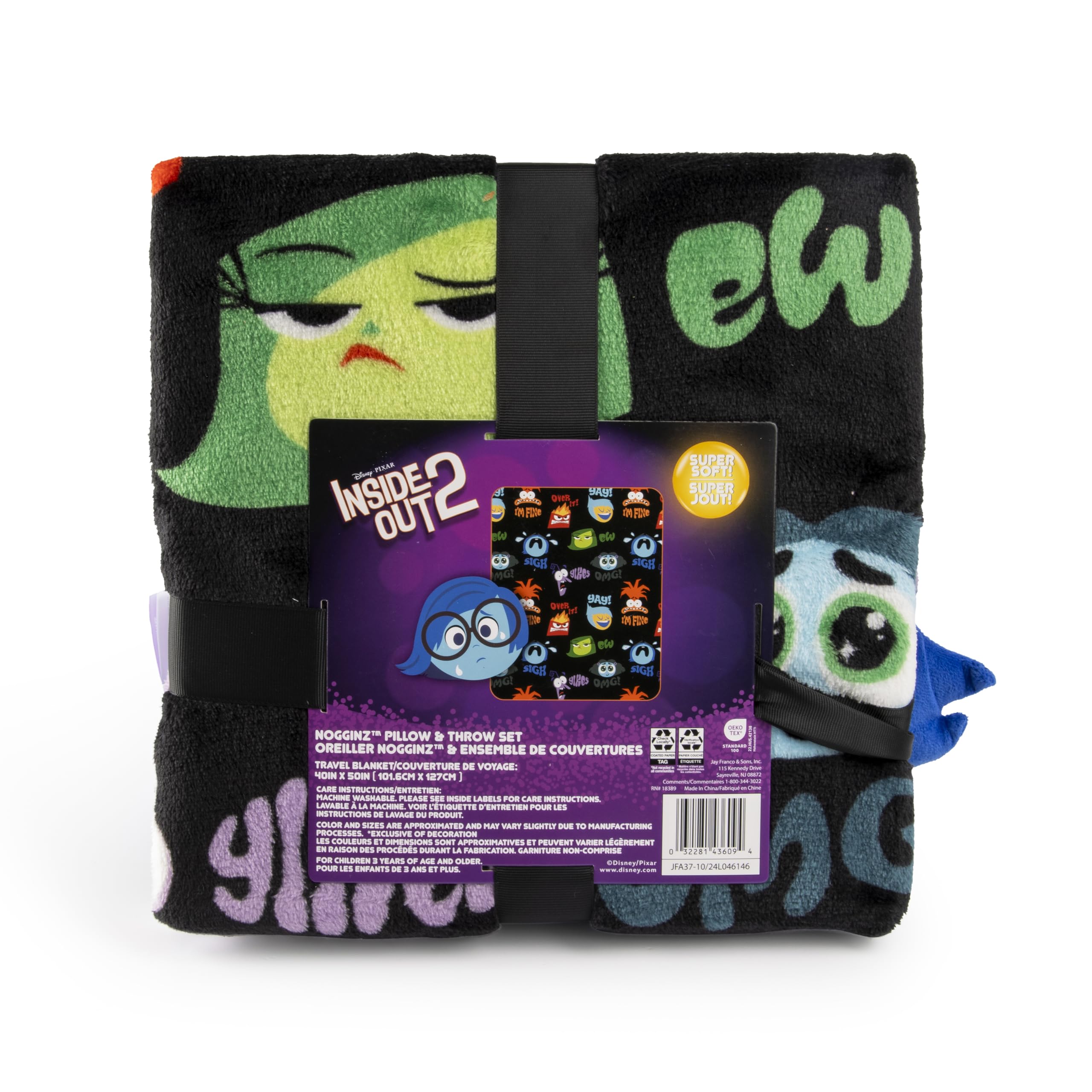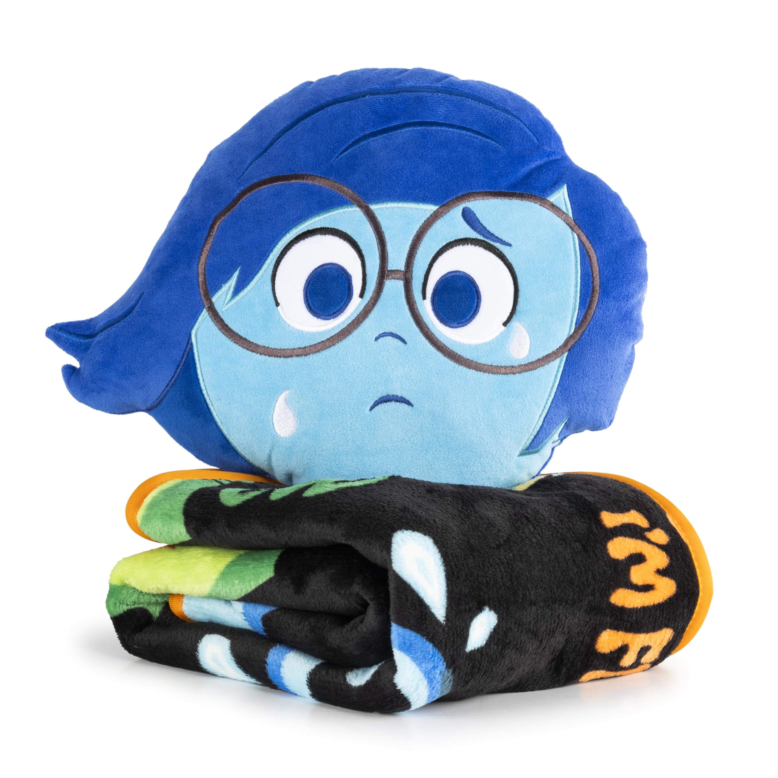 Inside Out fans will love this Sadness Nogginz Pillow & Travel Throw Set! This set can be used for lounging around the house, traveling in the car, or while watching movies. The super soft fleece is great for all seasons and our soft touch pillow makes for a great night's sleep! This set would make the perfect year-round gift for any child. Inside Out fans are sure to smile when they receive this super soft set! Set includes a throw blanket and small throw pillow. Throw blanket measures 40 x 50 inches and pillow measures 14 x 1 x 11 inches . Easy care, blanket is machine washable and pillow is clean spot only. 100% Polyester.