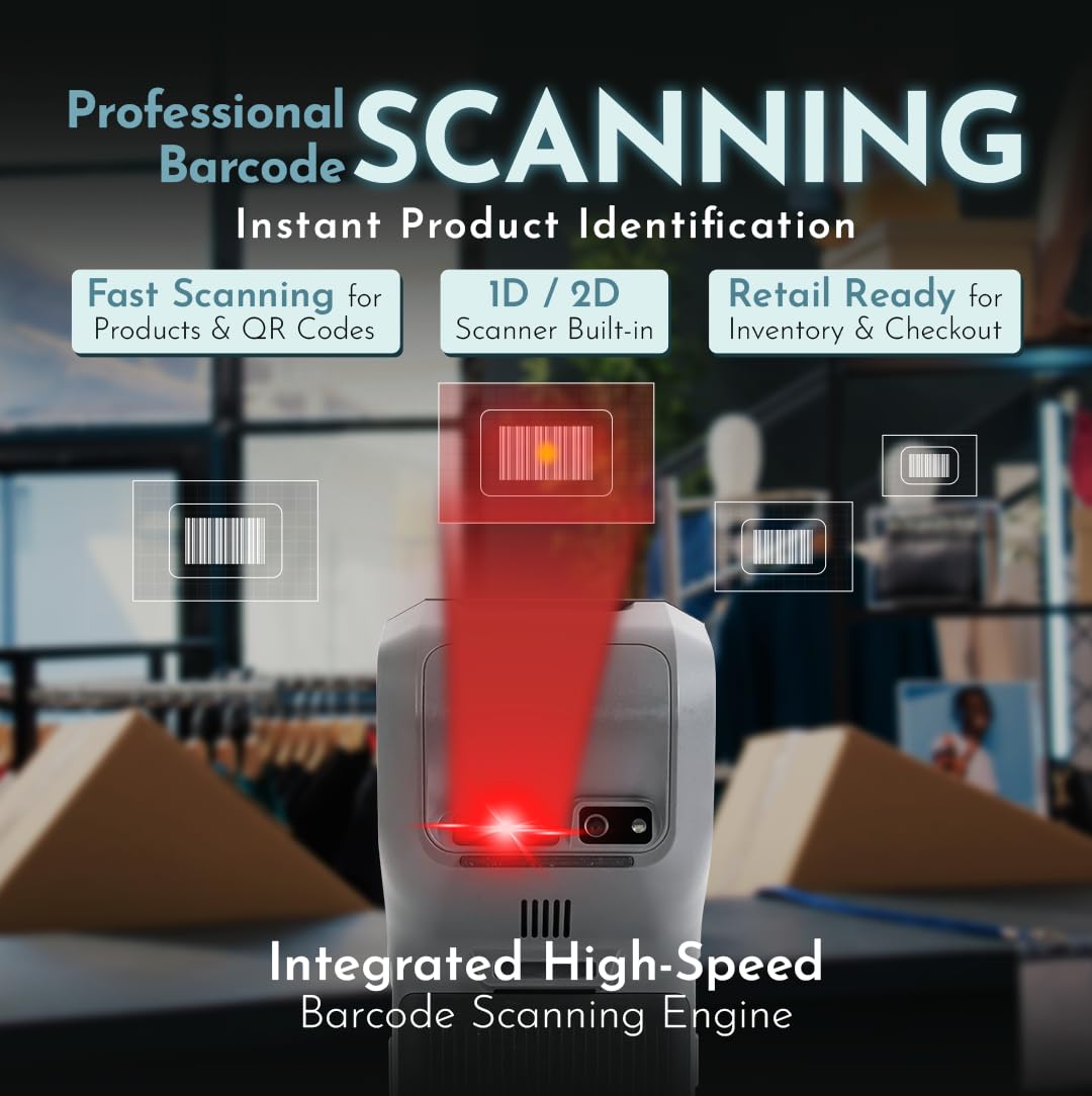 Integrated Professional Barcode Scanner: Unlike camera solutions, this terminal features a dedicated 1D/2D Barcode Scanner for instant, high-speed, and accurate reading. Essential for high-volume retail, warehousing, and rapid inventory control.