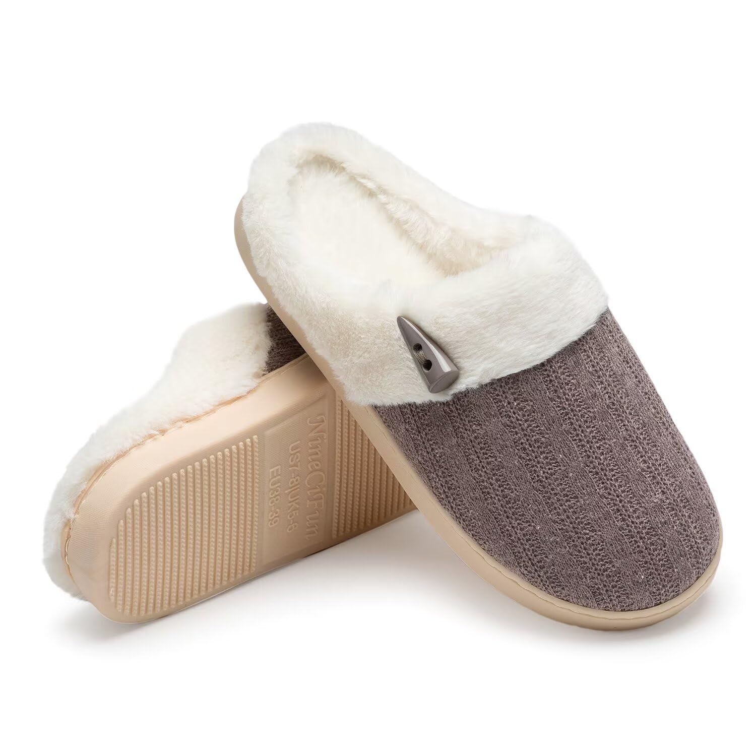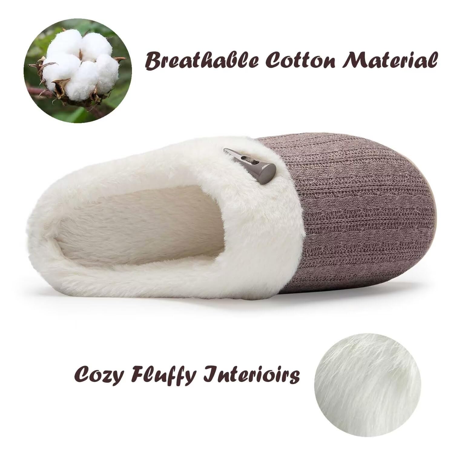 EASY SLIP ON STYLE:Step into comfort easily with these open back fuzzy bedroom slippers that are made with fluffy plush.Soft plush faux fur lining offers superior comfortability from the clouds.Also these comfy house shoes are so chic with knitting upper and horn button design