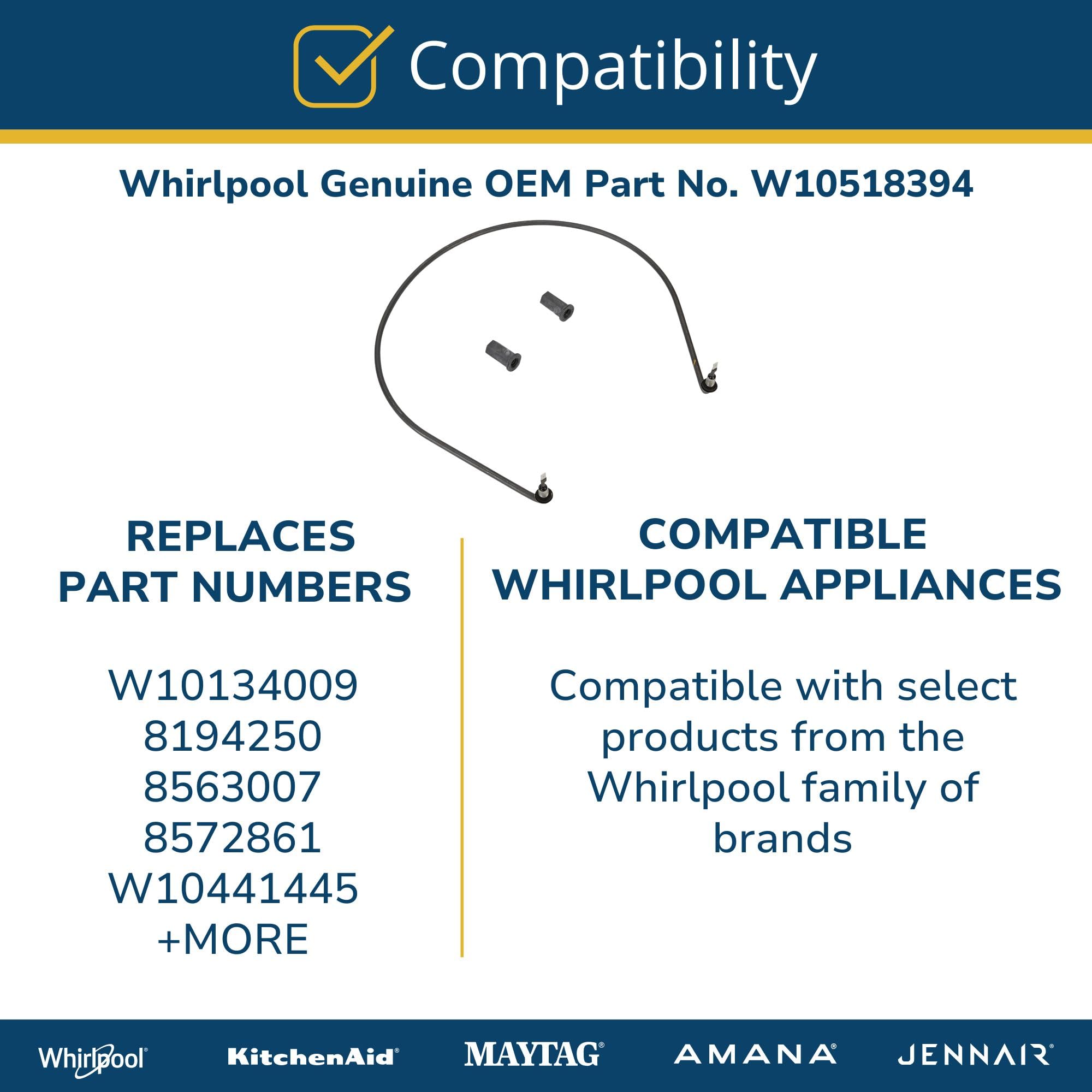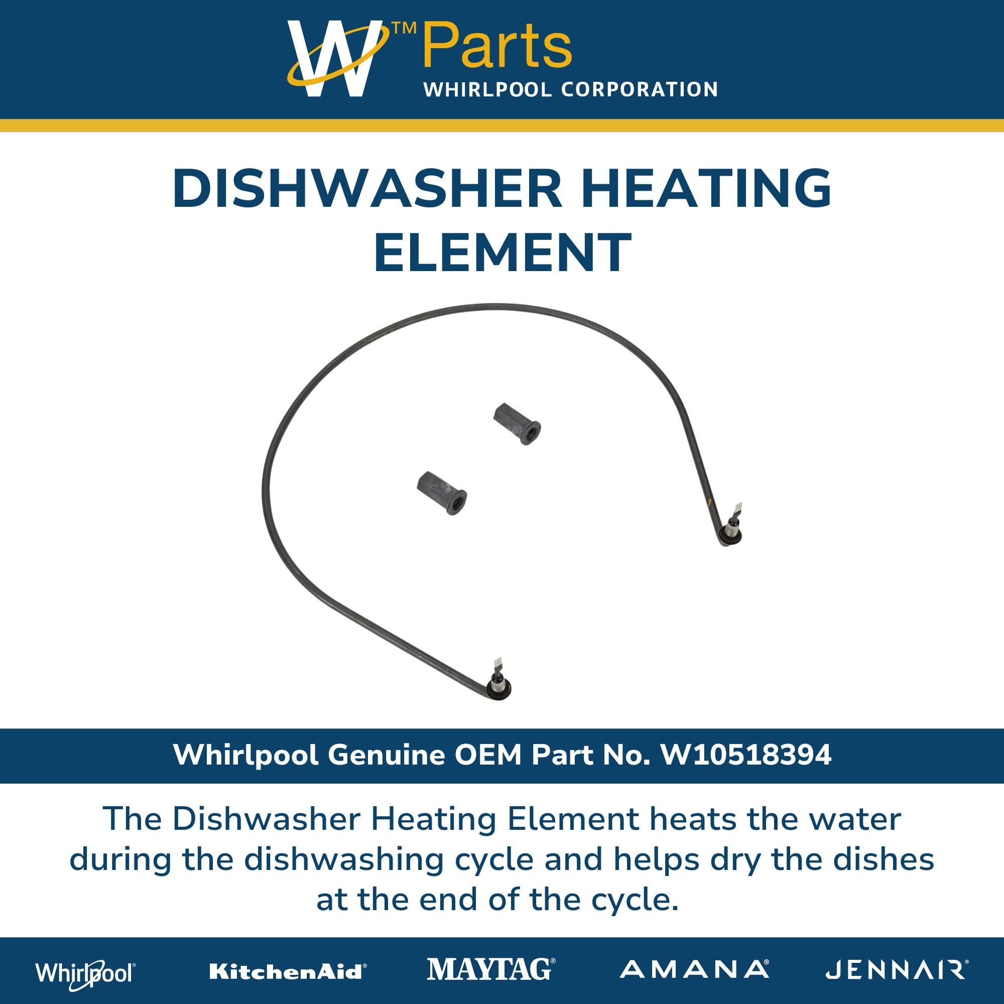 REPLACEMENT PART NUMBERS: W10518394 Dishwasher Heating Element replaces the part numbers W10134009, 8563007, 8572861, 8194250, and W10441445