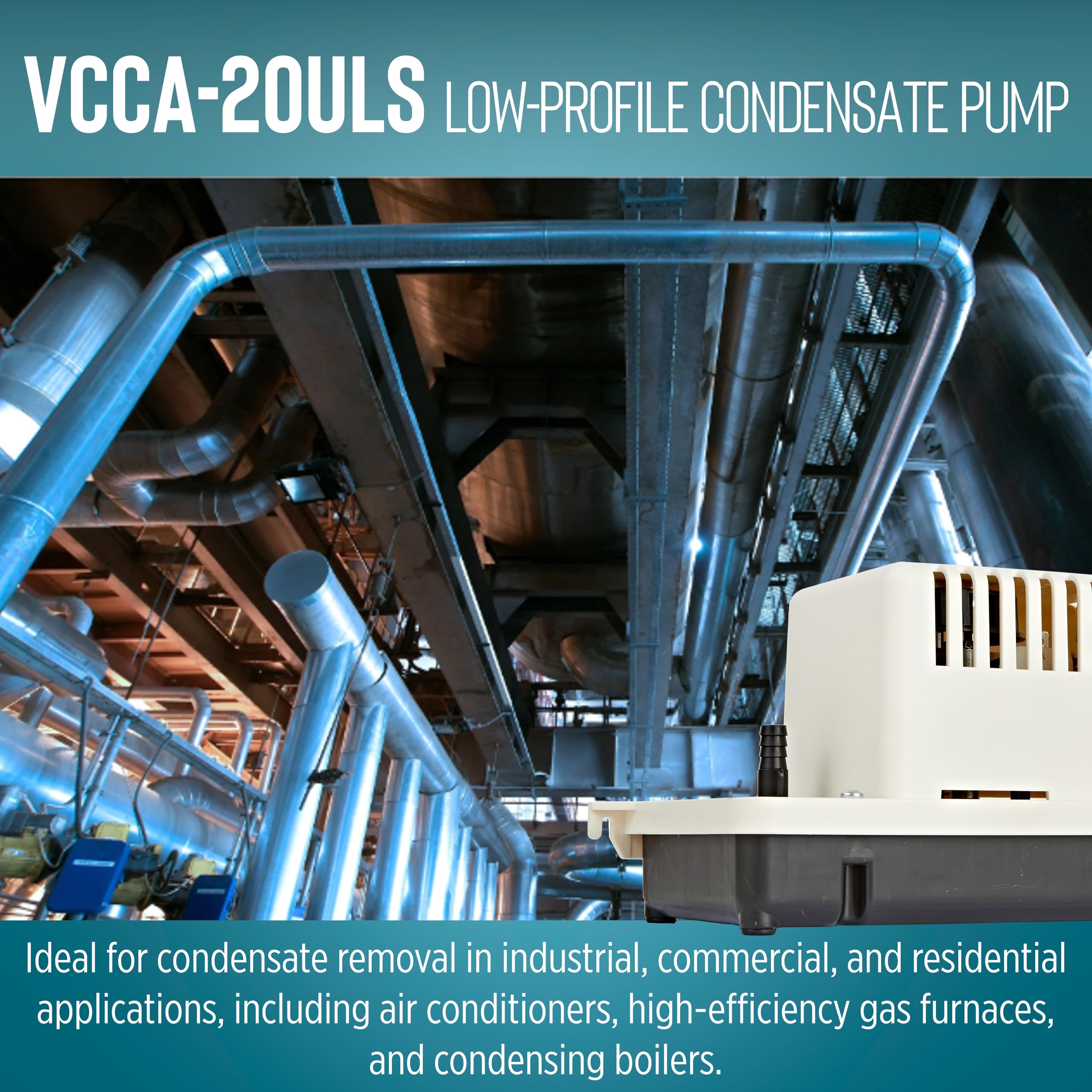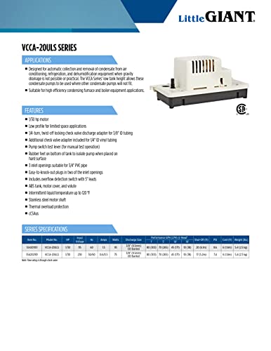 The Little Giant VCCA-20ULS 115-volt, low-profile condensate pump is suited for tight spaces. The dimensions are 11.96" long x 5.2" wide x 5.23" high. It is designed to removed condensate from air conditioners, refrigerators, dehumidifiers, boilers and furnaces. This pump comes with a safety switch which can be wired to shut down the system if an overflow situation is detected or it can be wired to activate an audible or visual alarm (not included.). This pump comes with a 6' cord and 3-prong plug. This pump is UL listed in Canadian and the USA. The VCCA-20ULS delivers up to 80 gph with a 17' shut-off and maximum of 7.4 PSI. It can handle intermittent liquid temperatures up to 120 °F. The VCCA-20ULS has 3-inlet openings suitable for 3/4" PVC pipe. Rubber feet on the bottom of the tank reduces noise when place on a hard surface. This pump comes with a switch test lever. It is equipped with a 1/4-turn, twist-off locking check valve discharge adapter for 3/8" ID tubing and an additional check valve adapter is included for 1/4" ID vinyl tubing.