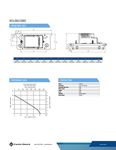 SPECIFICATIONS: 1/30 HP, 80 GPH at 1-ft. head, 20-ft. shutoff; Max PSI = 8.6, 6-ft. cord, 1.5 Amps, 93 Watts, cCSAus listed; thermal overload protected; overflow detection switch with 5-inch leads