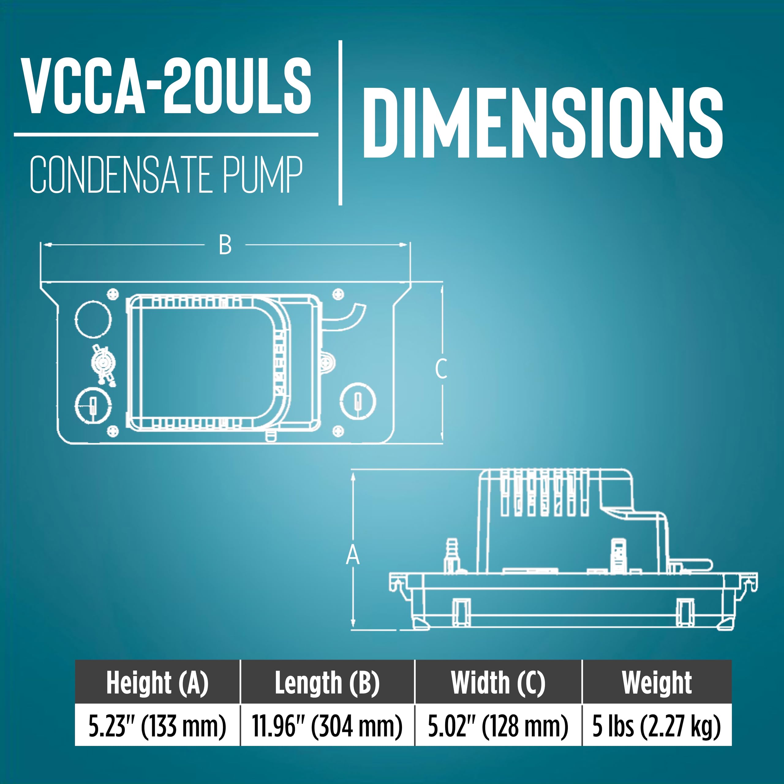 LOW-PROFILE CONDENSATE REMOVAL PUMP: the low tank height allows the pump to be used where other condensate pumps will not fit; unit dimensions are 11.96 in. wide x 5.02 in. deep x 5.23 in. high