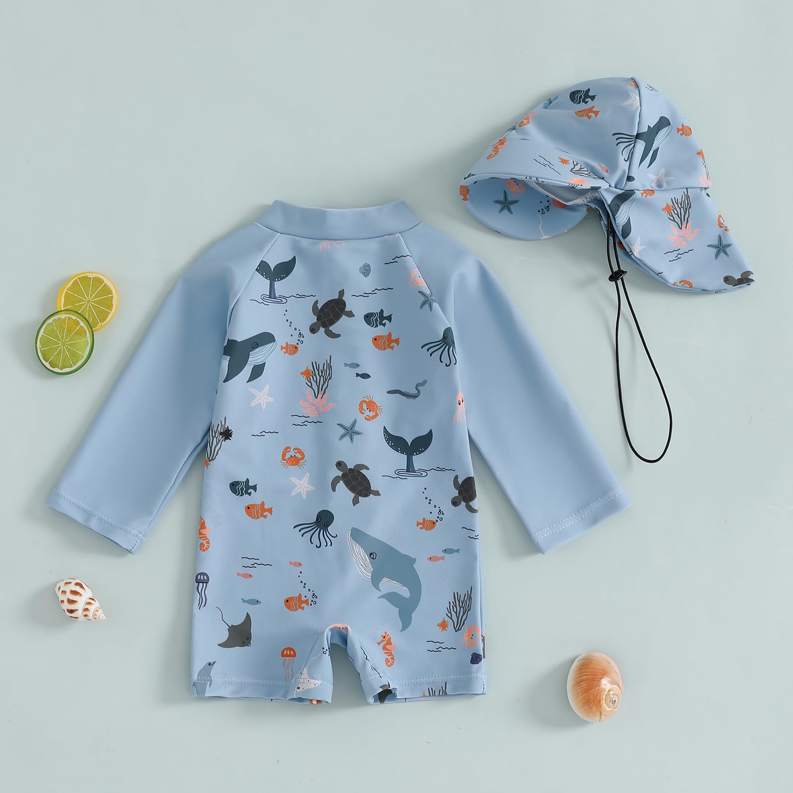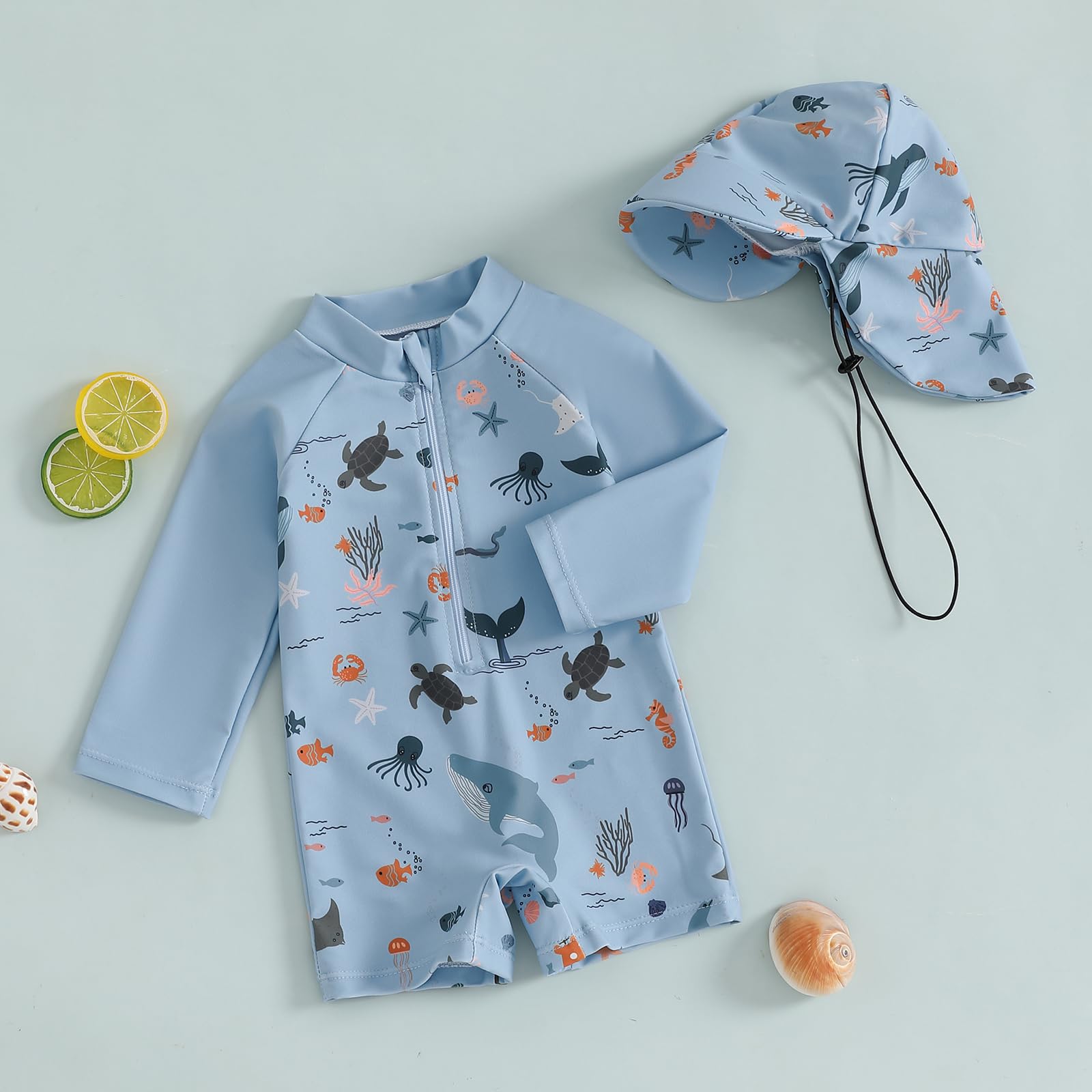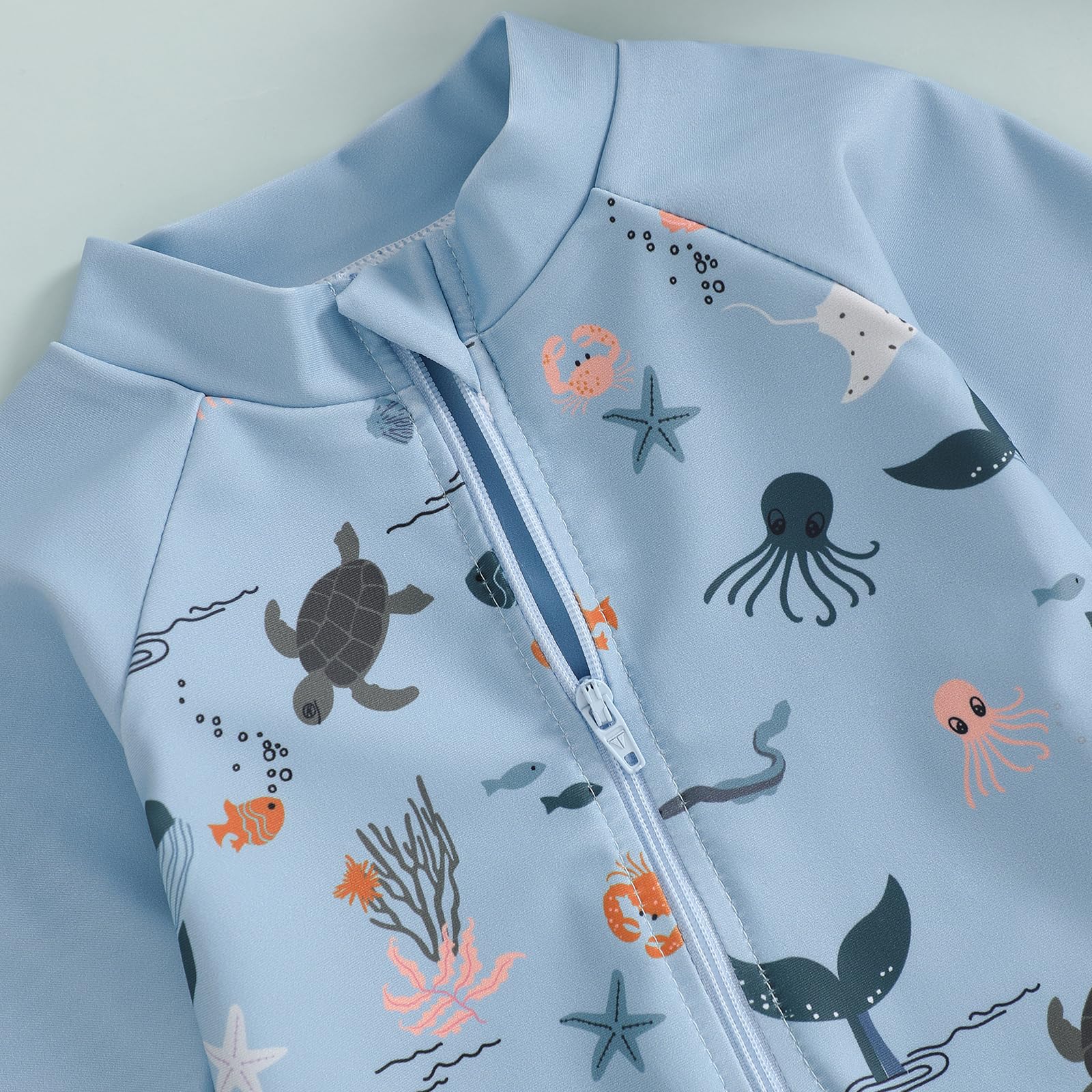 Design: Toddler bathing suit boy, infant long sleeve swimsuit boy, round neck, back/front zipper closure for easy on and off, newborn swimsuit boy, dinosaur/marine animal print, super cute and lovely, your little boy will stand out in the crowd