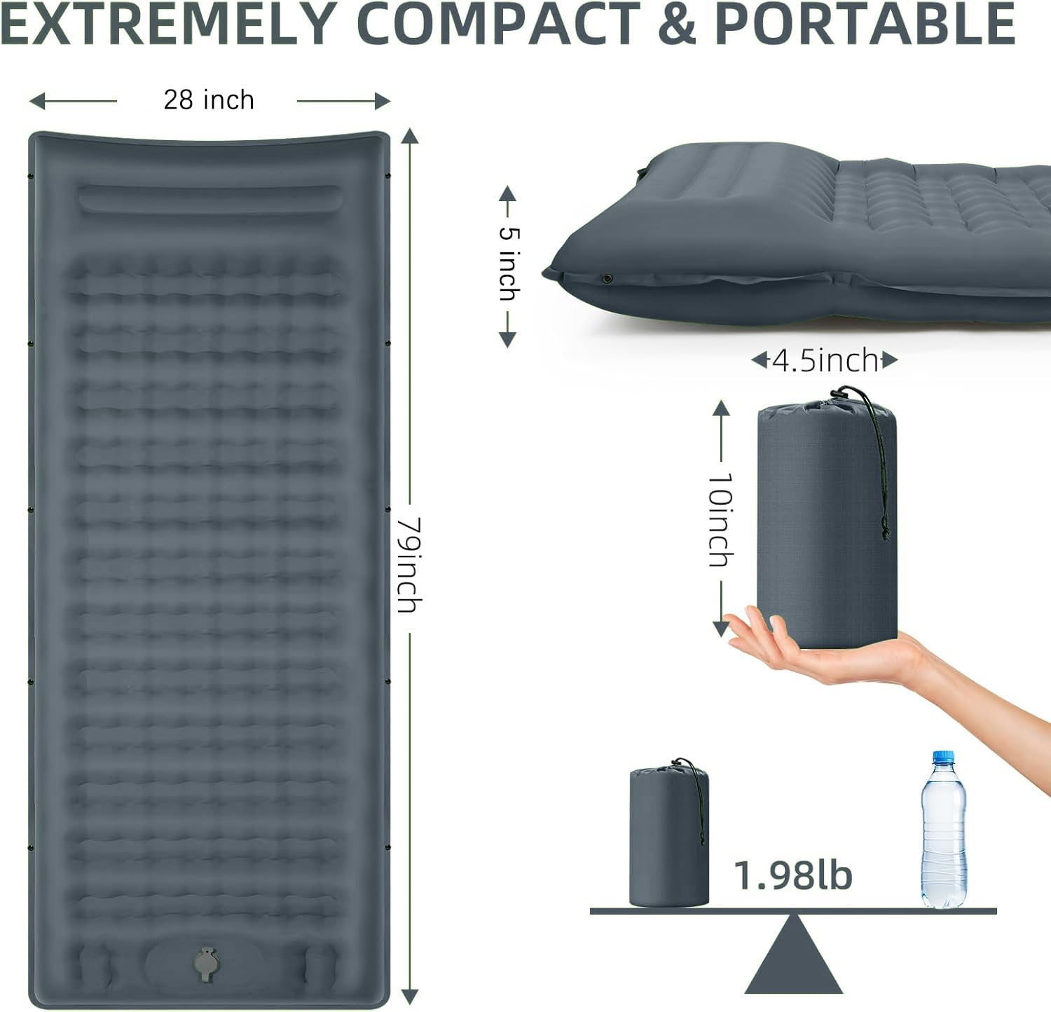 【Extra Wide & 5" Thick Sleep Support】 The self inflating pad for camping is up to 79“L x 28”W x 5“Th, after inflating keeps you away from the uneven ground and hard rocks. The innovative egg-shaped air cells and built-in pillow are designed to relieve back and neck pressure, allowing you to freely adjust your body balance and comfort, whether on your back or your side, ensuring maximum comfort and warm for your sleep all night!