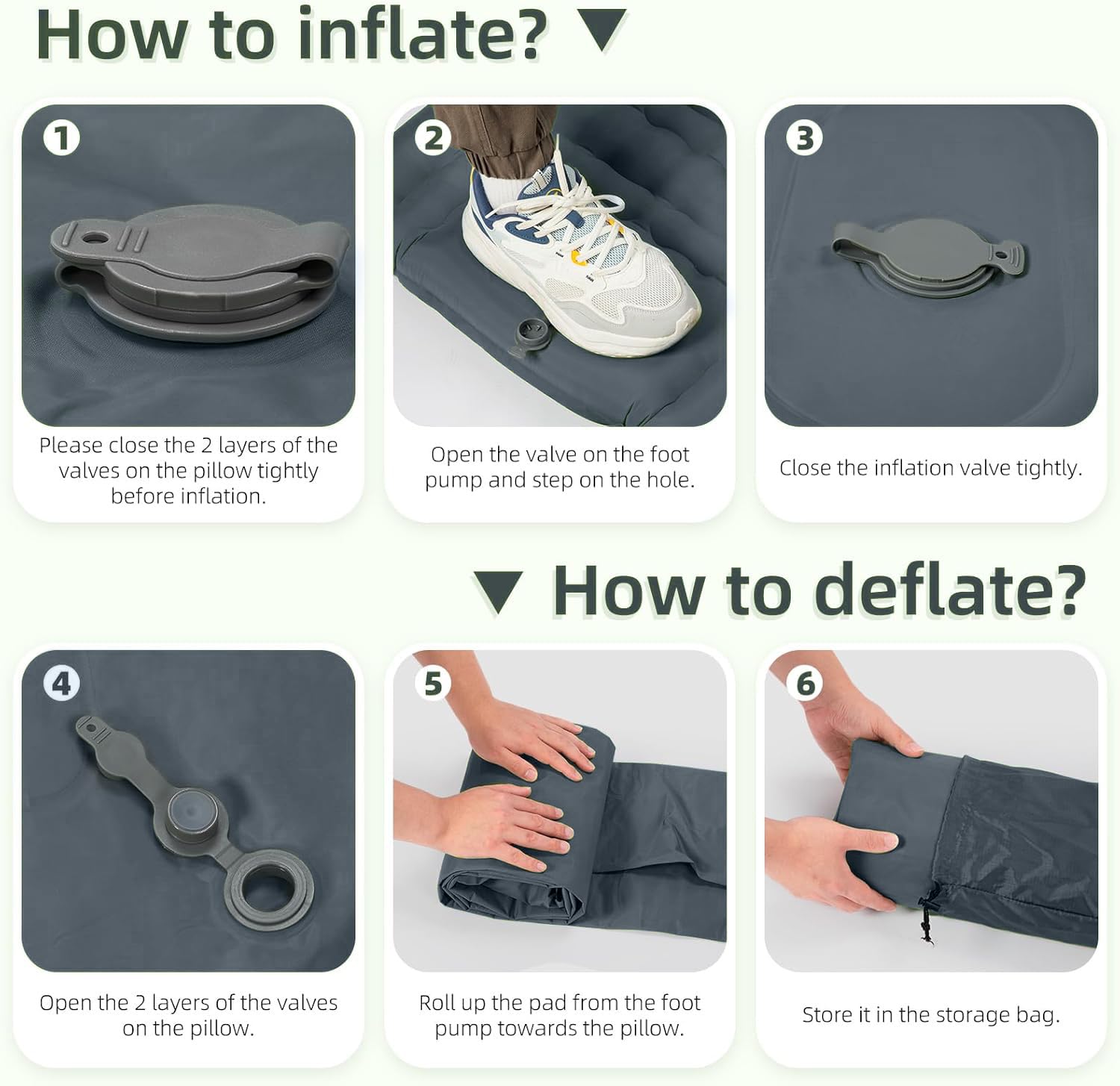 【Only 30s Step to Inflate & 1s Deflate】 Including an innovative built-in foot pump- Just pedal 30-60s to fully inflate the camping mat, which is convenient and easy, no longer need to inflate with your mouth, hands or carry a pump, and it only takes 1 second to quickly deflate. With the upgraded version of the air release valve with no leaking film, you shall never worry about air leaking!