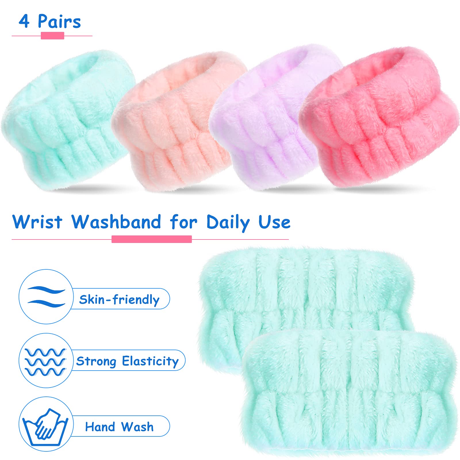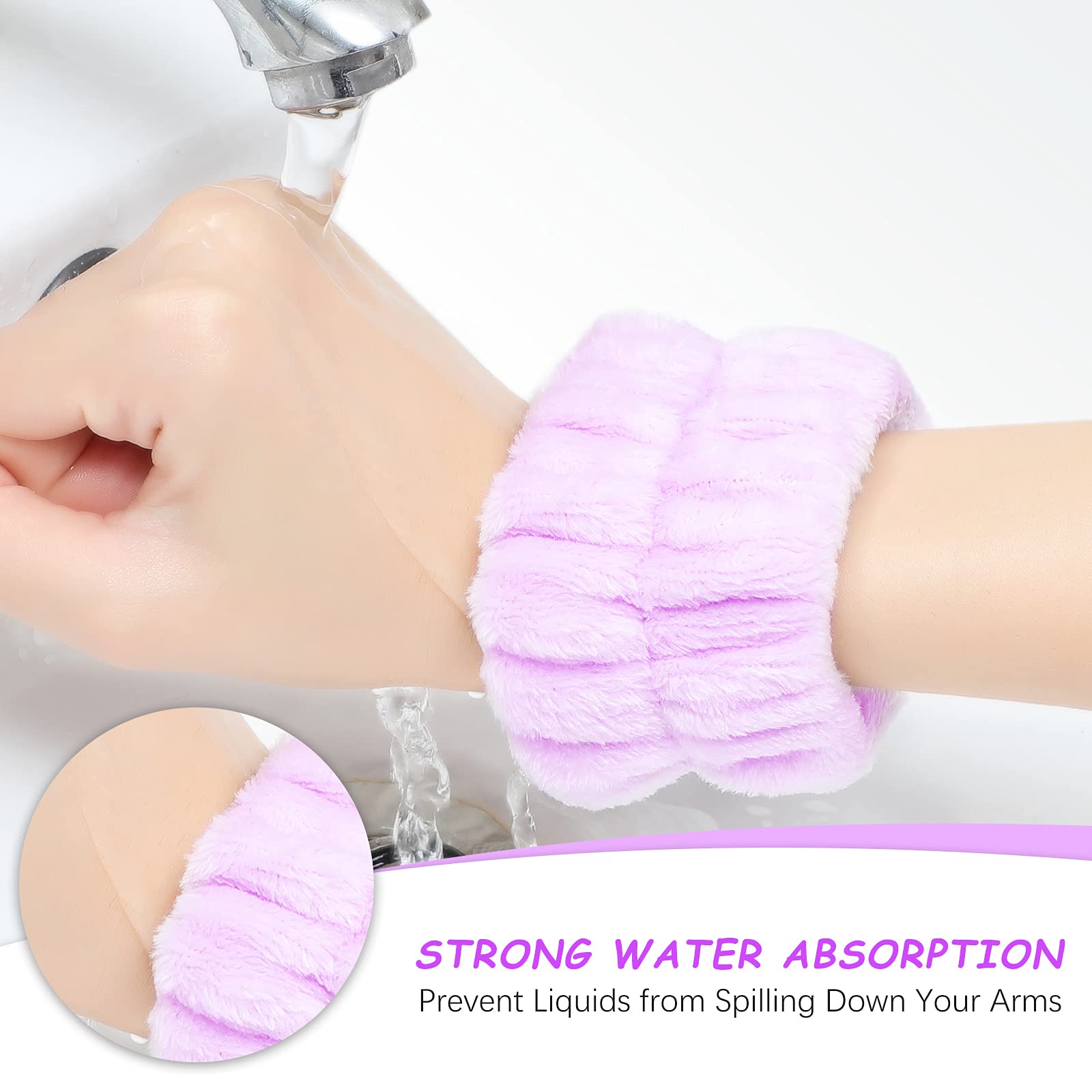 Wrist spa wash band set: there are 4 pairs of microfiber wristbands in different colors, you can wear these cleansing cuffs in line with your headband to reduce and prevent liquid from spreading and spilling down to your arms when washing