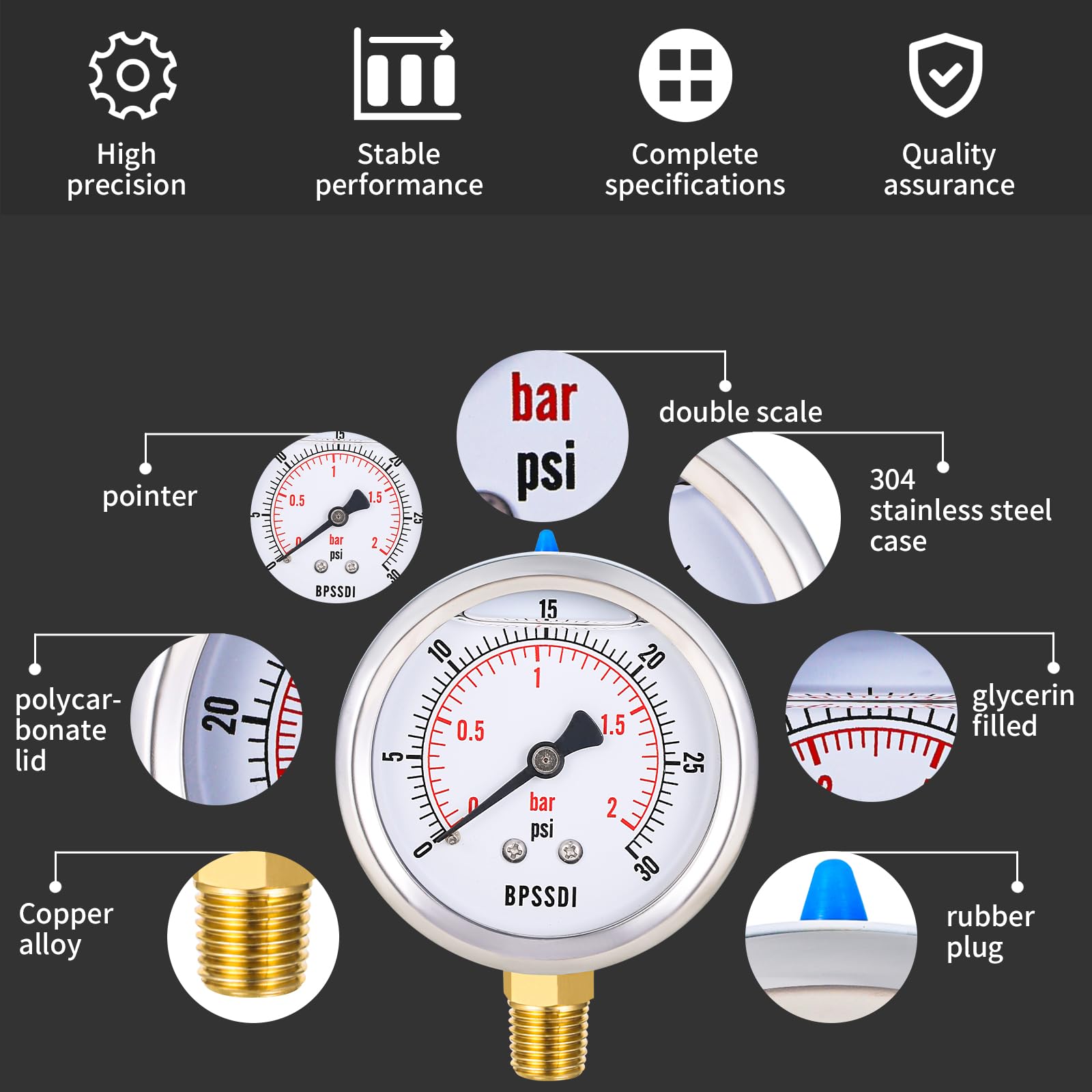 Dual Scale Display - The 2.5" pressure gauge dial is in Psi/Bar with 2.5% accuracy rating for a variety of pressure tests.