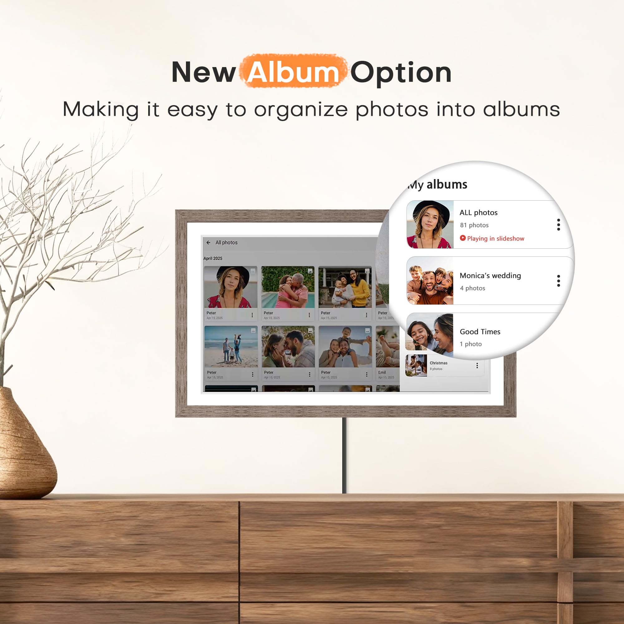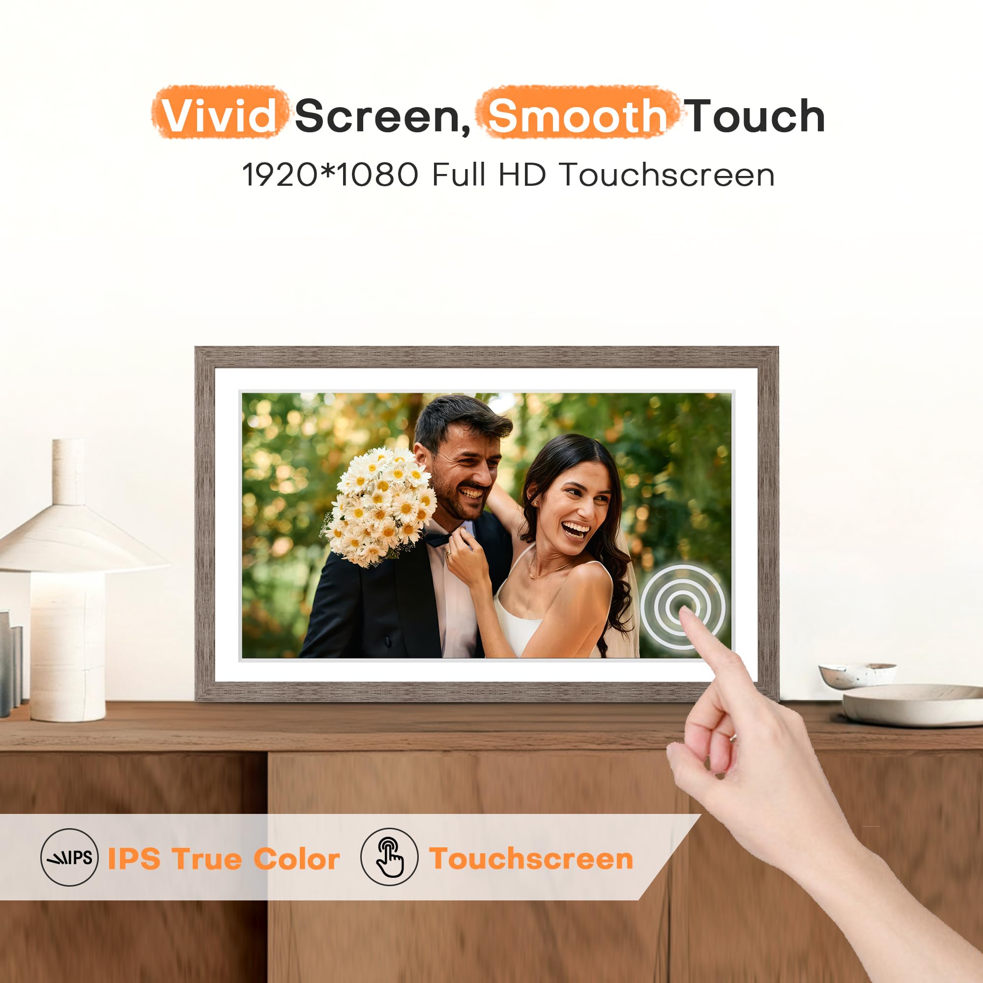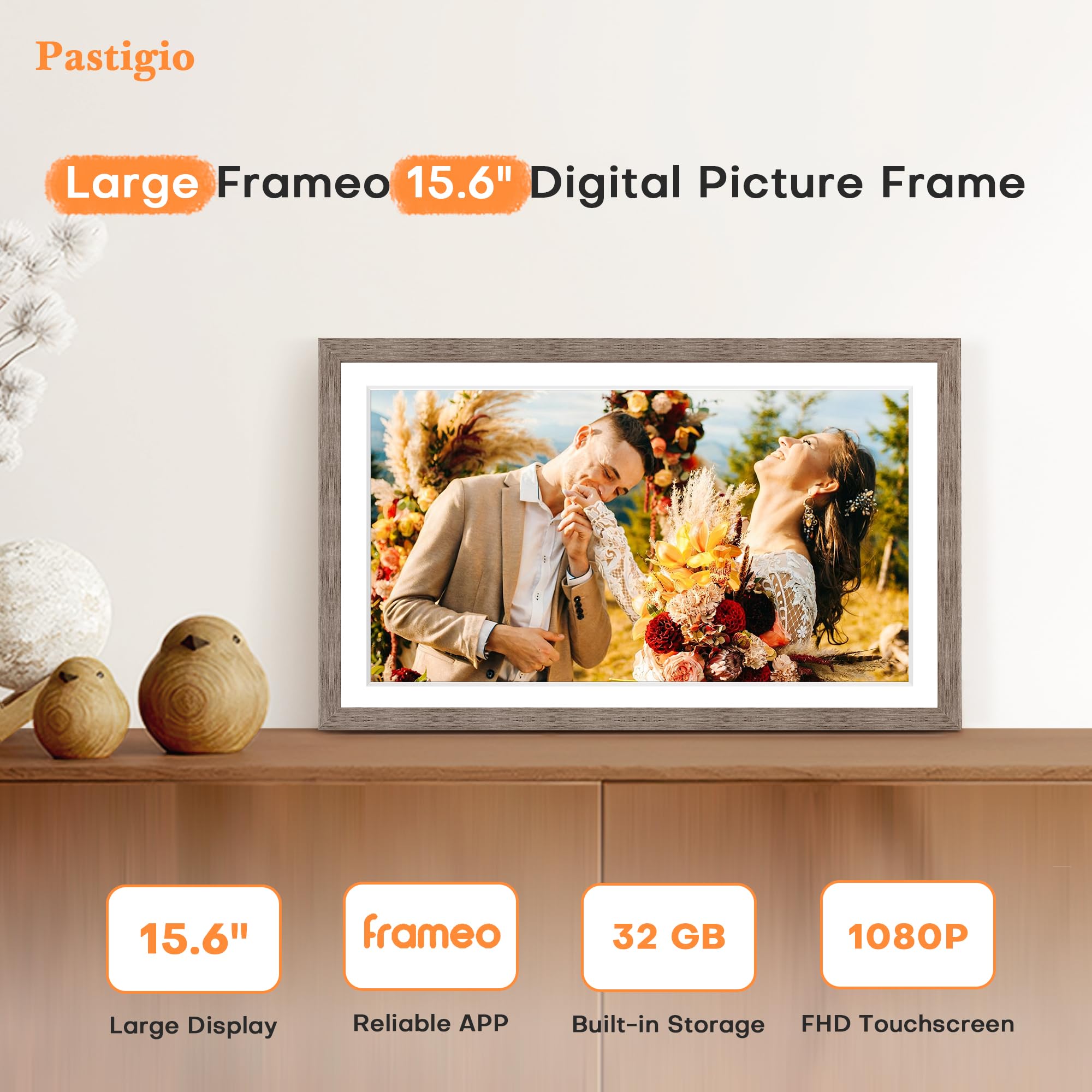 FHD IPS Touch Screen Display; Pastigio wifi picture frame equipped with a 15.6 inch digital panel with FHD 1920x1080P for vivid color and exquisite details. Border design with neutral tone complements a wide range of interior styles. Through this rotating picture frame, You can see the furry hair of your lovely pet, see the youthful freckles on smiley faces, see how every teeny tiny detail builds up your colorful life. Multiple image formats are supported, JPG/JPEG/BMP/PNG, and video format by MP4
