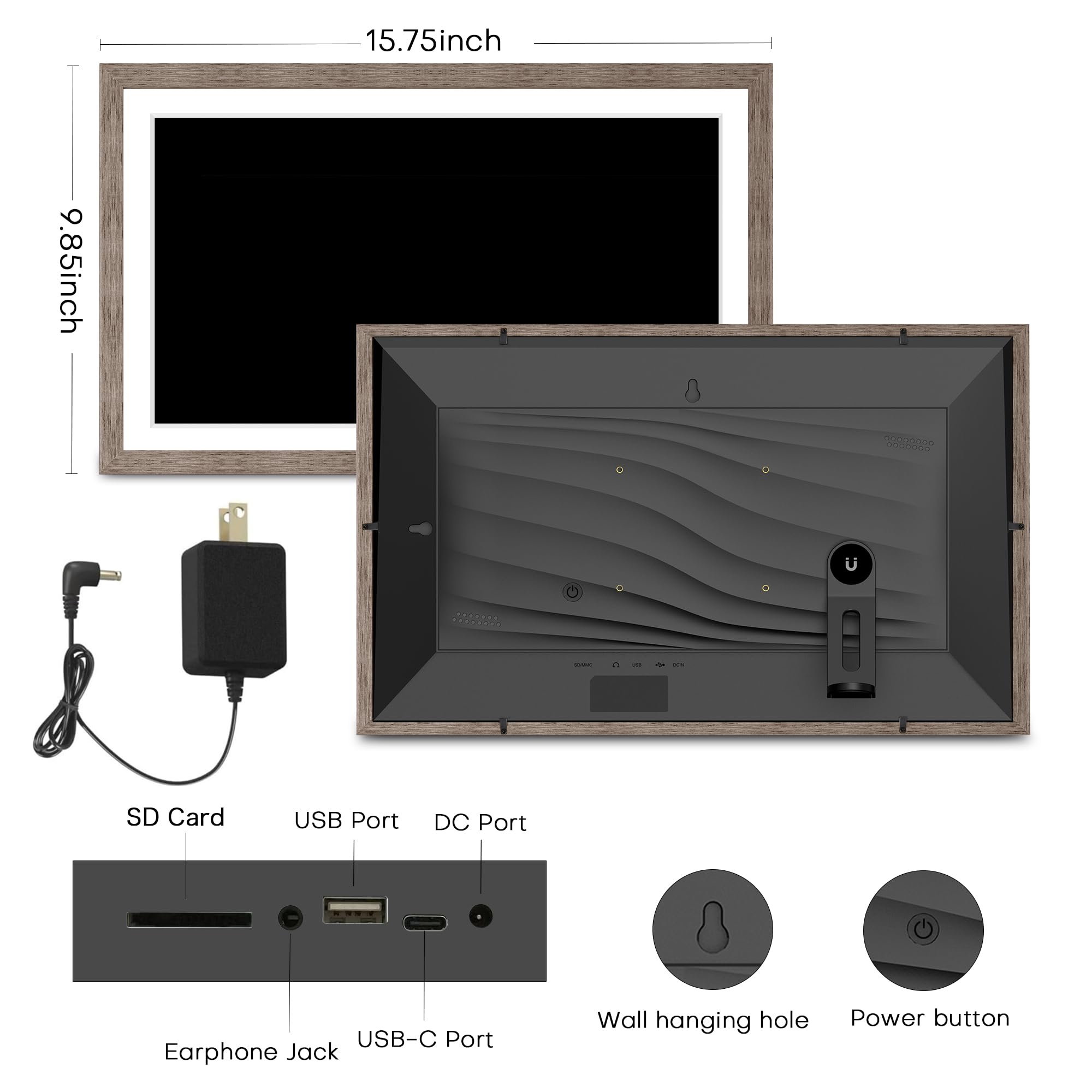 Support Non-WiFi Transmission; If WiFi and apps seem overwhelming for you or your family, no need to worry! Our digital picture frame 15 inch supports non-WiFi transmission. You can easily upload photos via Full Sized SD Card /USB Drive (Only support FAT32 format), or through computer (USB-C cable needed). This user-friendly feature is perfect for seniors, eliminating the need for apps or WiFi. Also, the Full Sized SD card or USB drive can be used directly as external storage for the frameo electric frame