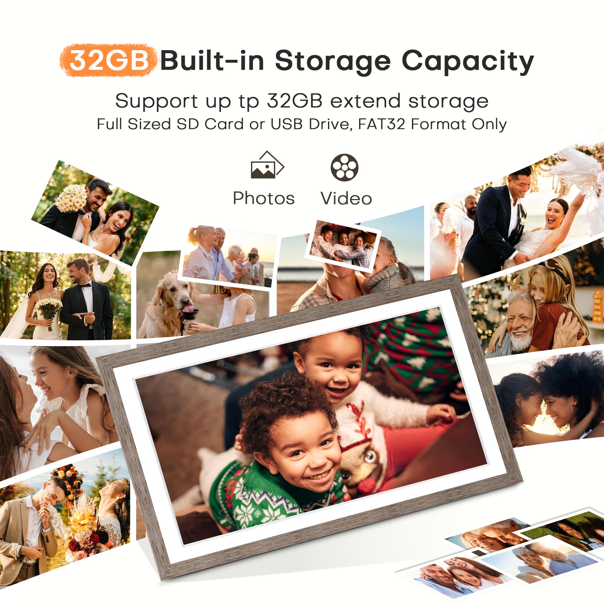 Instant Share via Frameo APP; Connect your digital picture frame to WIFI, and share photos and videos(Max.15s) quickly via a reliable App- Frameo to our digital photo frame from anywhere, privately and safely, no member numbers limited. Compatible with Frameo APP, no extra app needed. Our electronic picture frame slideshow has 32GB built-in memory and support up to 32GB external storage, enables you to share 50,000+ photos. Also, you can transfer via external storage or through a computer, no Wi-Fi needed