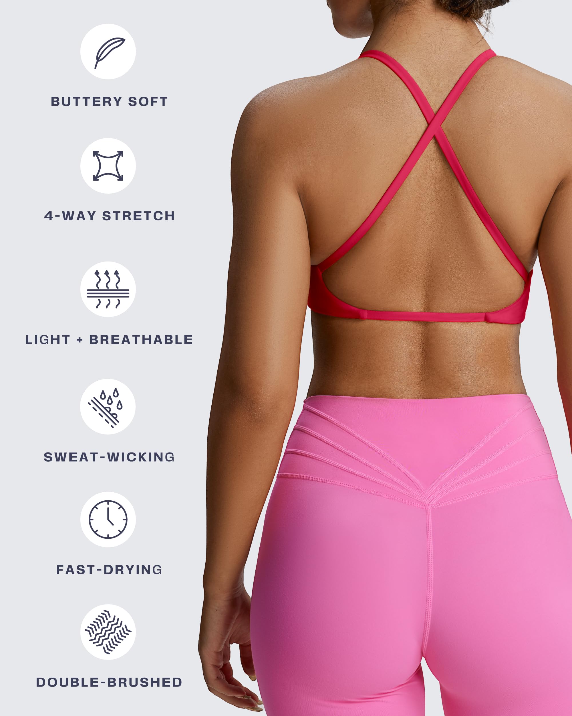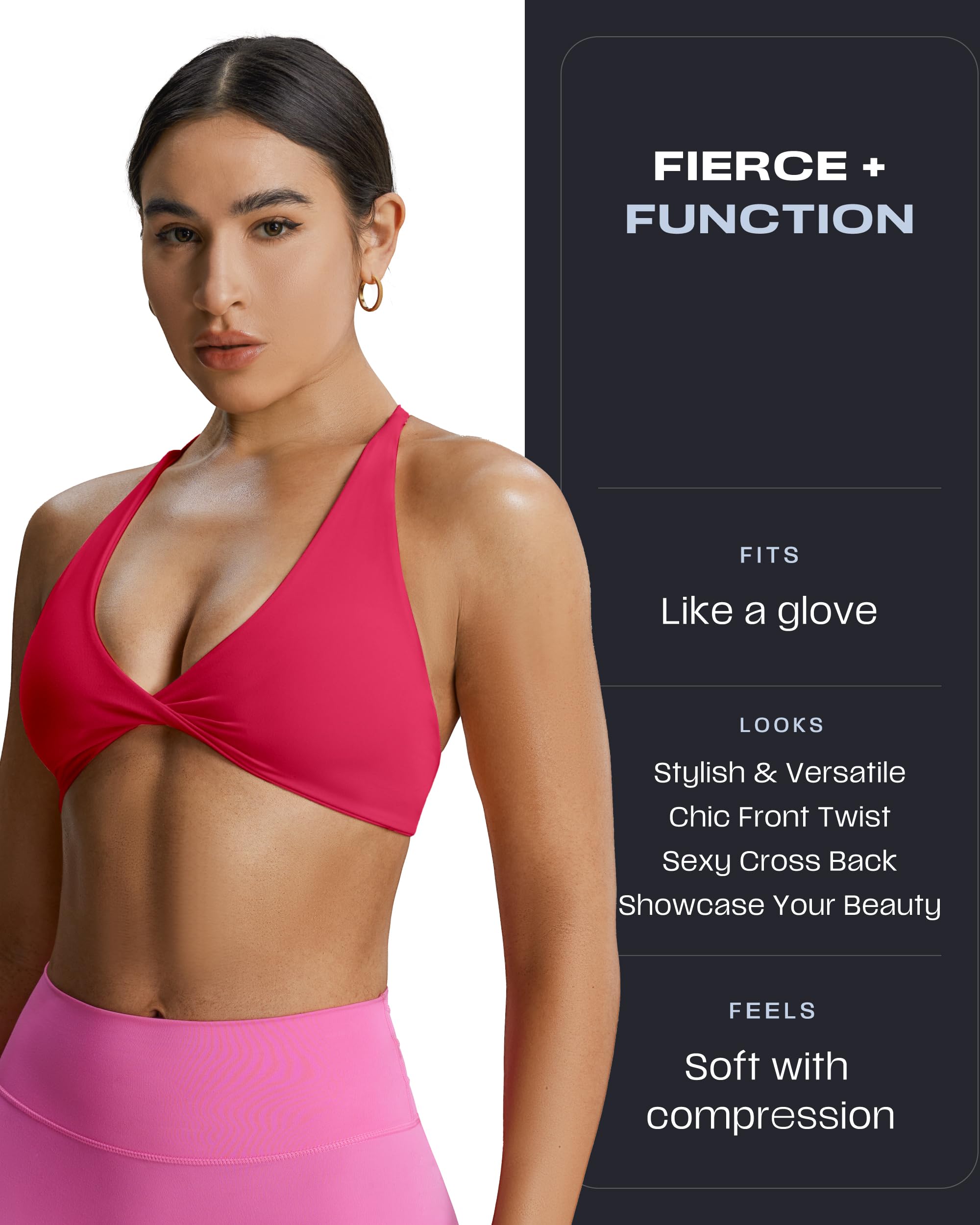 The Sienna twist womens sports bra featuring thin crossed back straps and padding, despite small straps, it doesn’t bite into your traps and cause neck pain