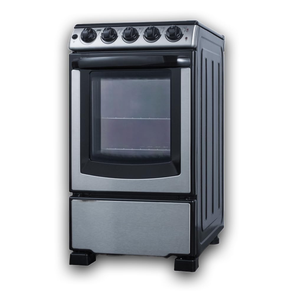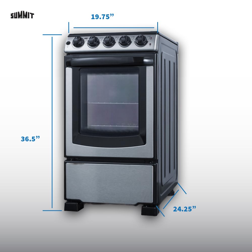 Luxury design and quality in compact size: This 220V electric range is just under 20" wide, perfect for smaller spaces and apartments.. The front manifold, oven door, and lower panel feature a stainless steel finish, with a black trimmed oven window and handle for a modern look. Versatile design includes a removable 2" high stainless steel backguard, allowing a standard range or a slide-in look that allows you to integrate the unit with your own design.