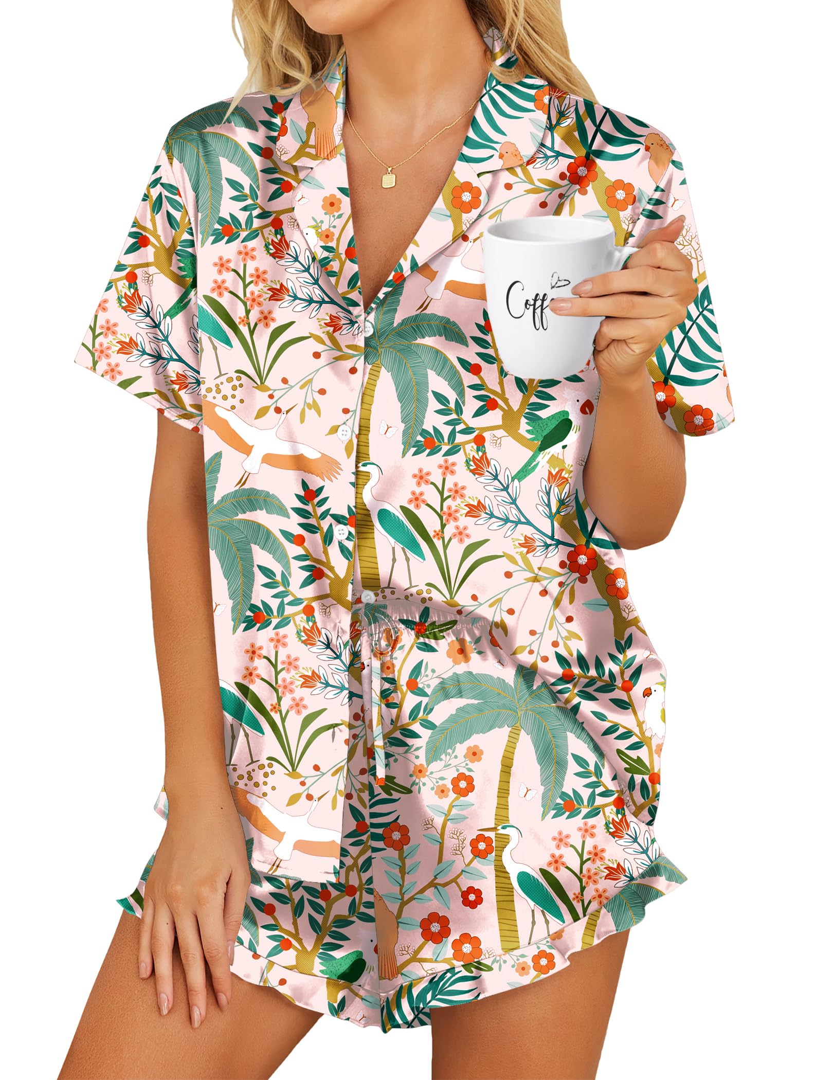 【Unique Fashion Designed】: 2 Piece Satin Pajama Set Featuring Relaxed Style, Short Sleeve, Classic Notch Collar, Full Button Design is easy to put on and take off. Cute Print Pj Set With Elastic Waist Contrast Trim Pajama Shorts will give you more comfortable and freendom feeling when you wear it.