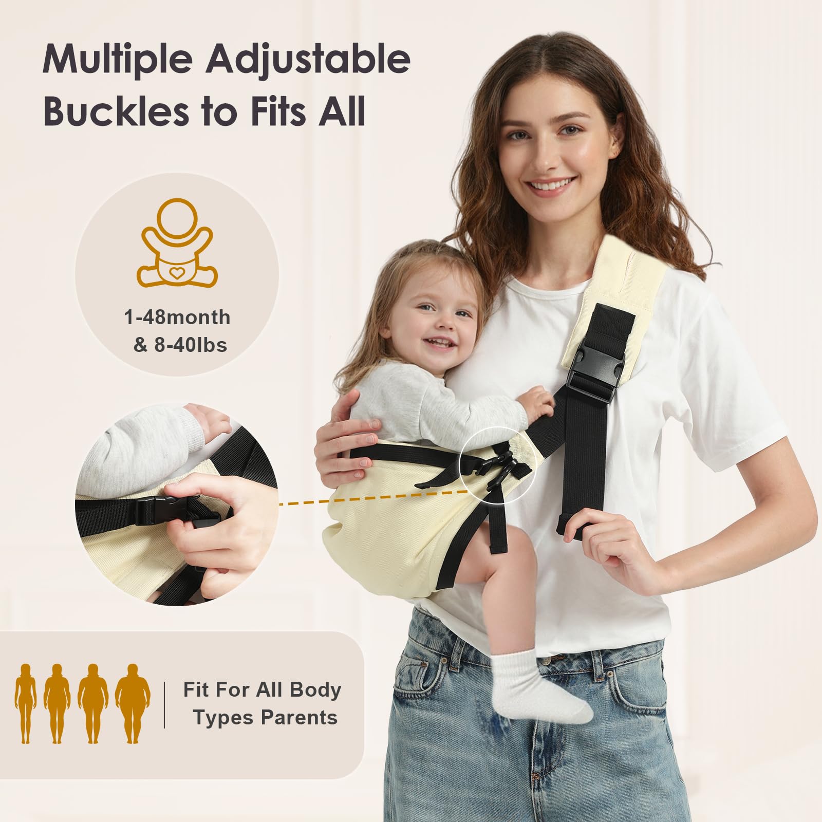 Scientific Support: This baby sling carrier has passed the CPSC safety certification, adopts an ergonomic M-shaped sitting position design, and fits the natural curve of the baby's spine. It is suitable for development needs from 1 to 48 months.