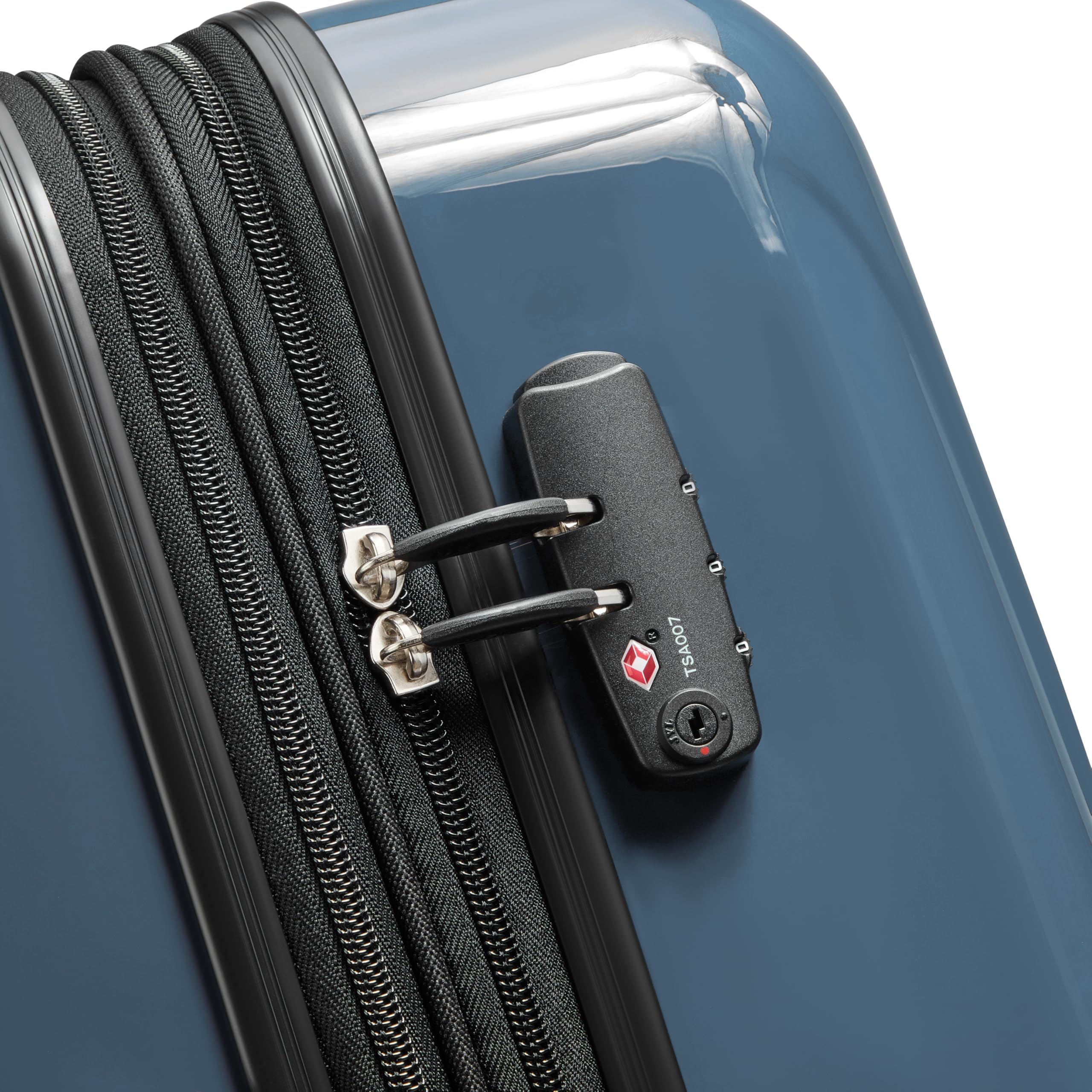 Integrated 3-dial TSA approved combination lock for security; suitcase expands up to 2 inches for additional packing space