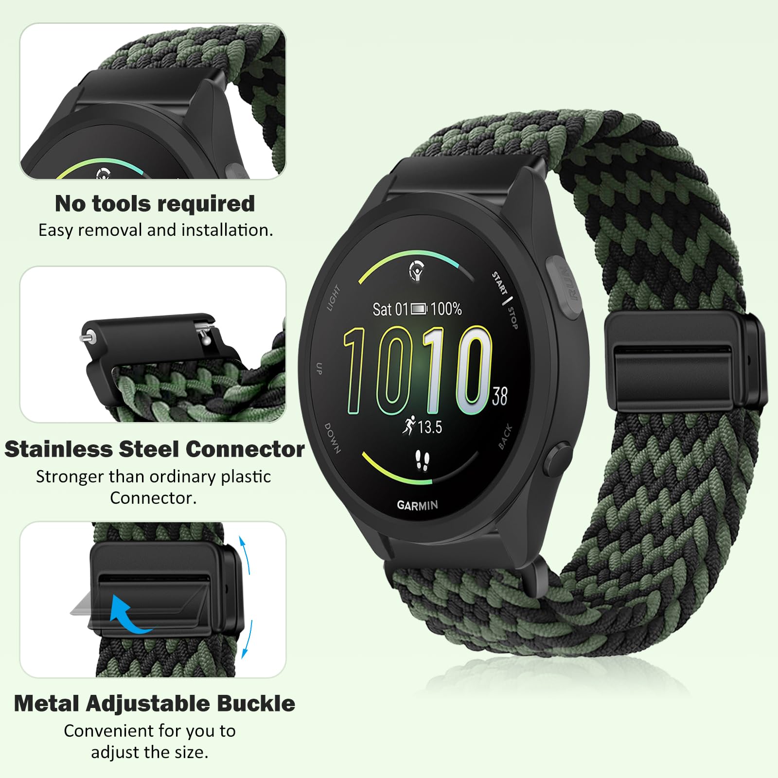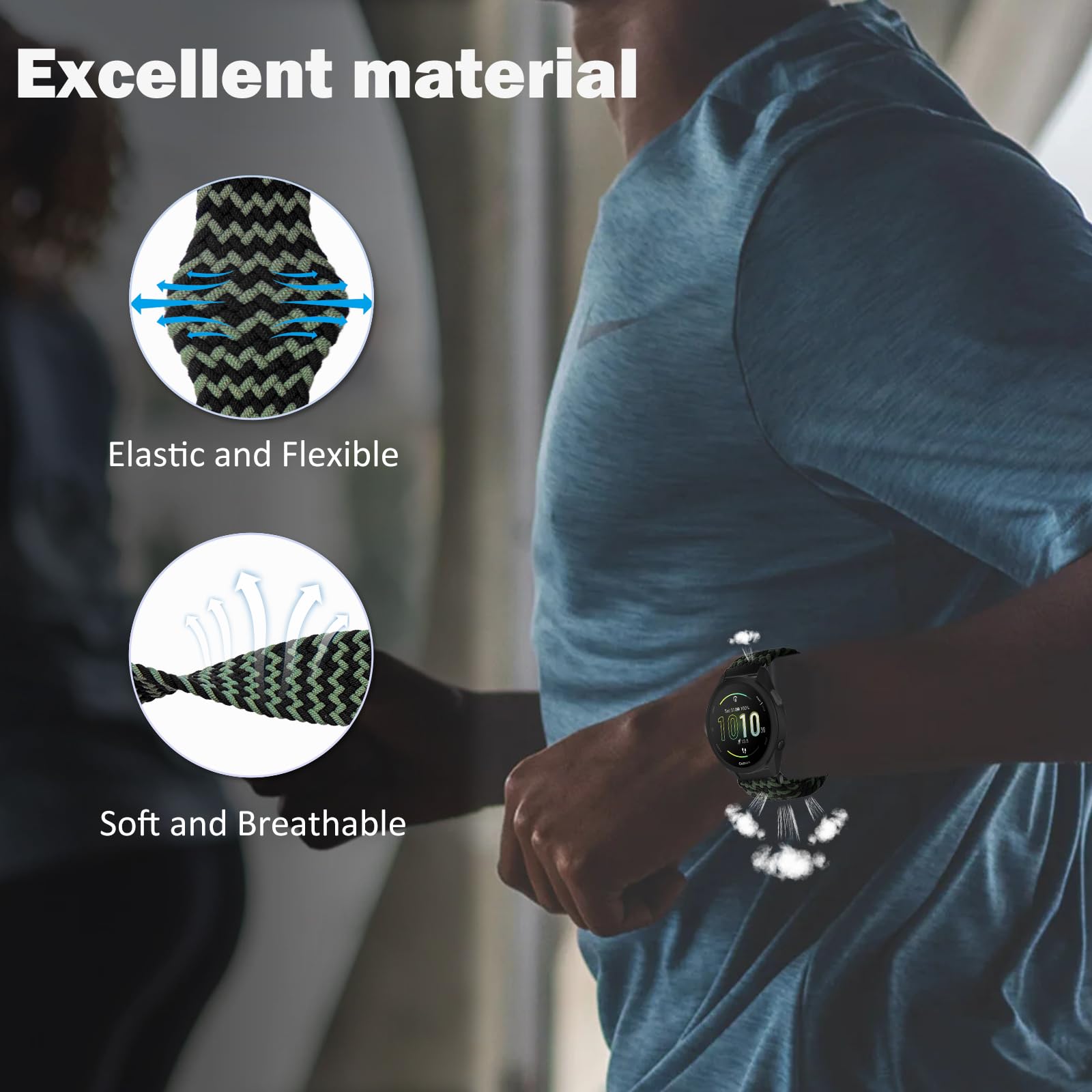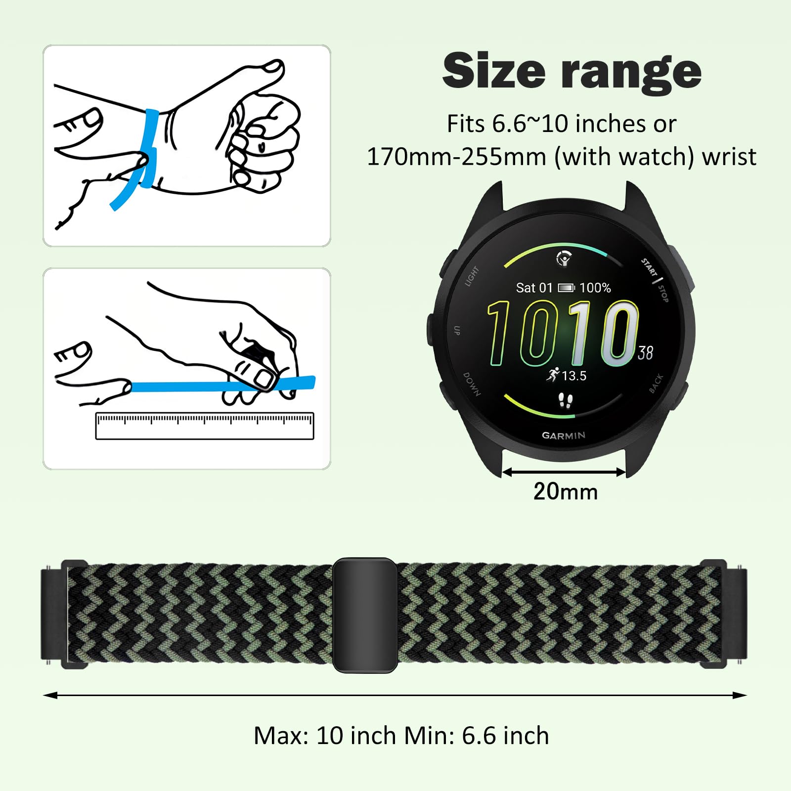 【Compatible Models】This band is compatible with Garmin Forerunner 570 42mm/Forerunner 165/Forerunner 165 Music/Vivoactive 6/Vivoactive 5/vívomove Trend/Venu Sq 2/Venu Sq 2 Music Edition/Venu 2 Plus /vivomove Sport /vivoactive 3/vivoactive 3 music/Approach S50/Approach S44/Approach S42/vivomove 3/Garminmove 3/Forerunner 245/Forerunner 645/VivoMove/Garminmove/Compatible with Amazfit T-Rex 3 Pro 44mm/Active 2/Active/GTR Mini/GTS 4/Bip 3.(Or Fits any watch with a 20mm strap.)