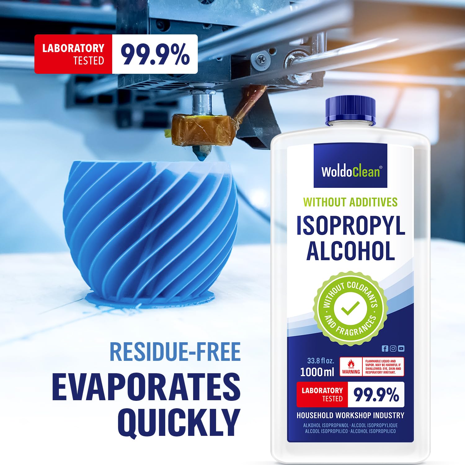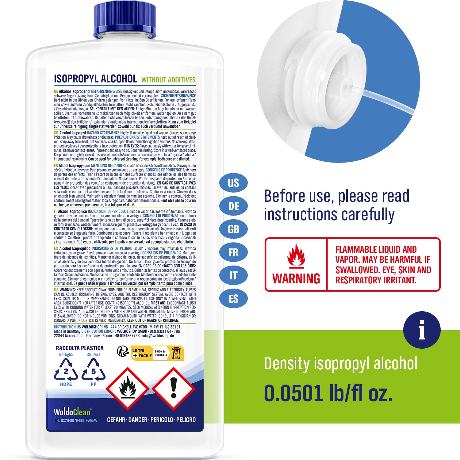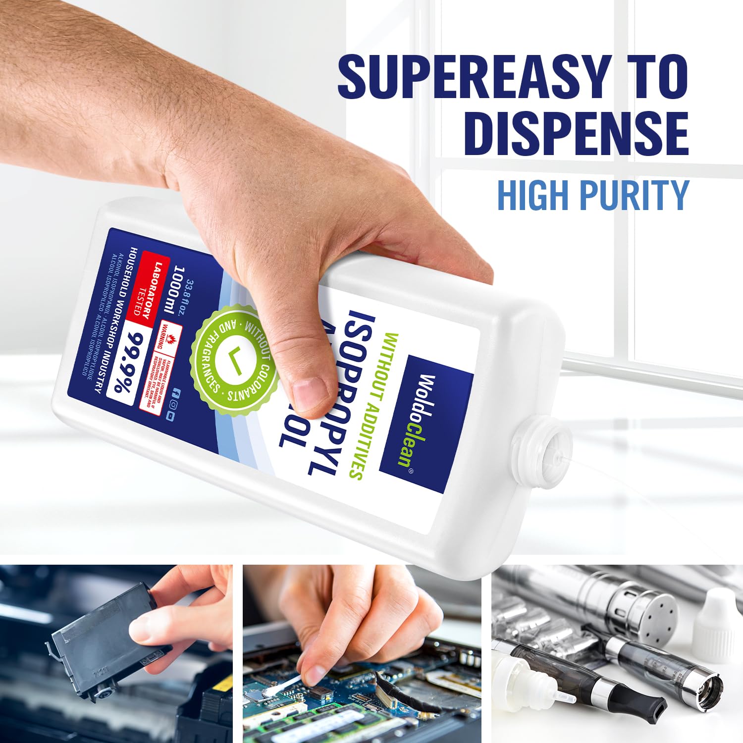 99.9 % laboratory-tested isopropyl alcohol for reliable cleaning & sterilizing. Supplied in a durable HDPE bottle with child-safe cap for safe handling & storage.