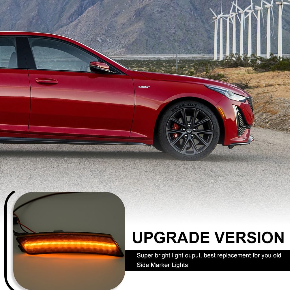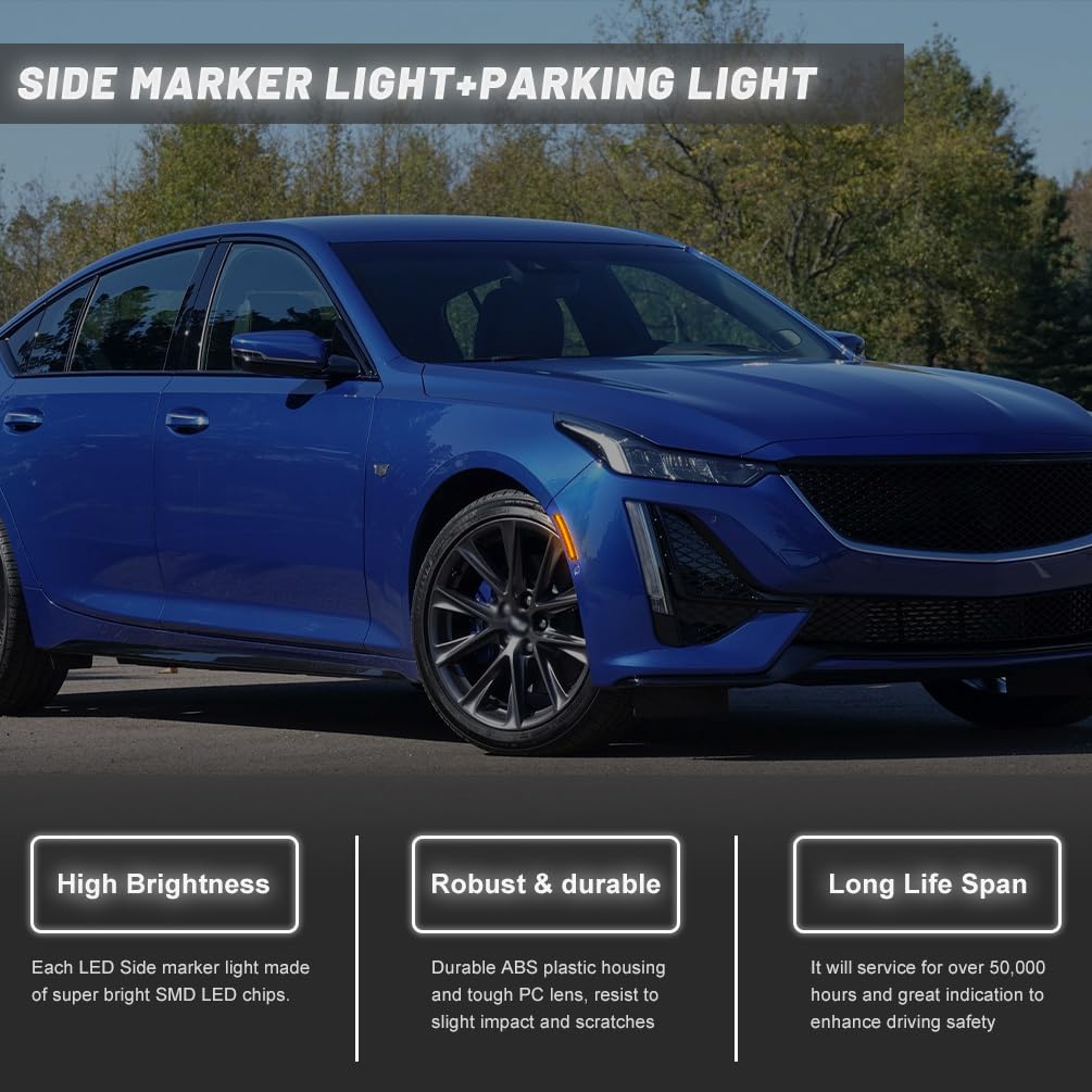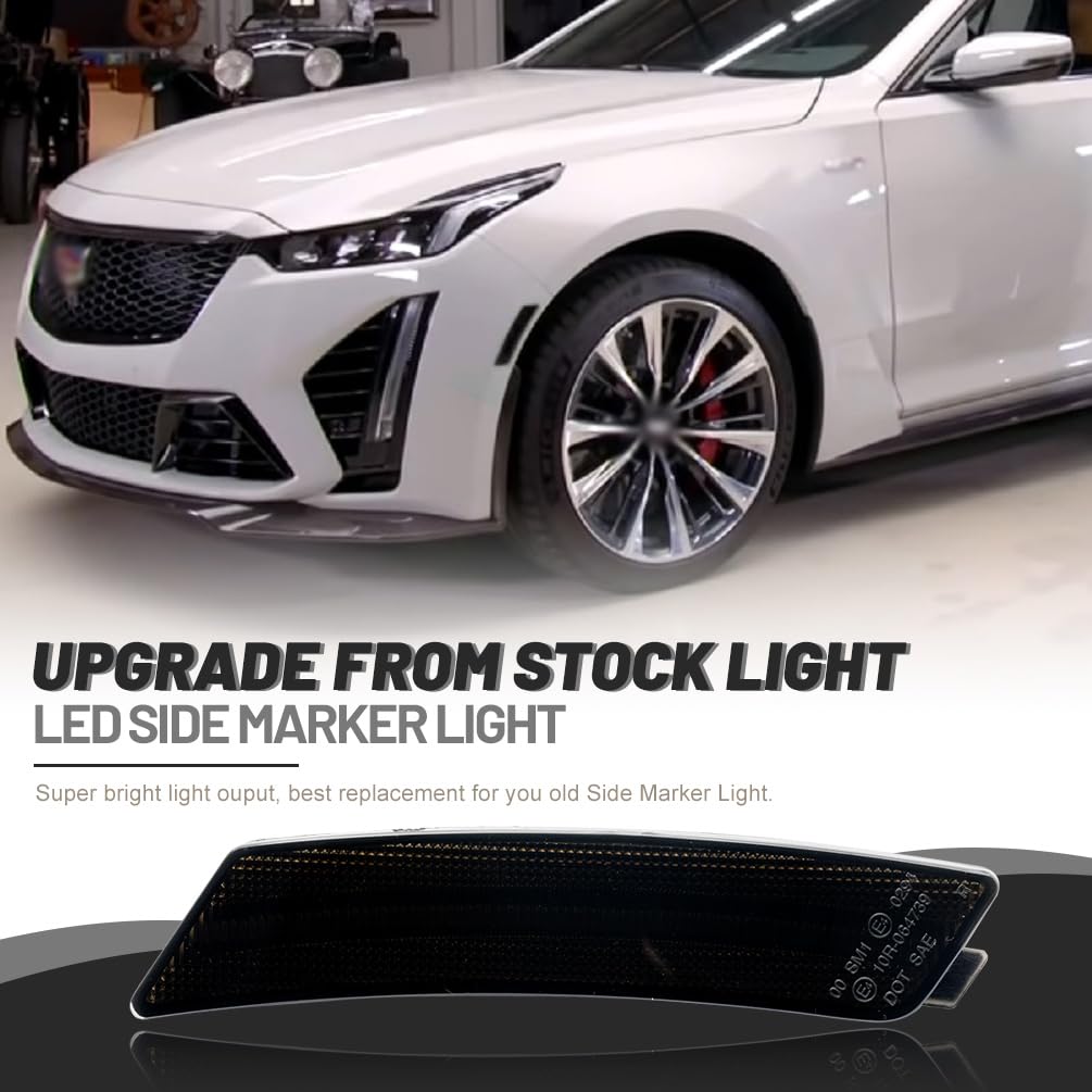 Function: Compatible with 2020 2021 2022 2023 Cadilla.c CT5. Upgrade your CT5 side markers with a new fashion style smoked lens look and brighter amber LED lighting. Elevates your muscle car's aura and even adds additional safety visibility driving signal features.