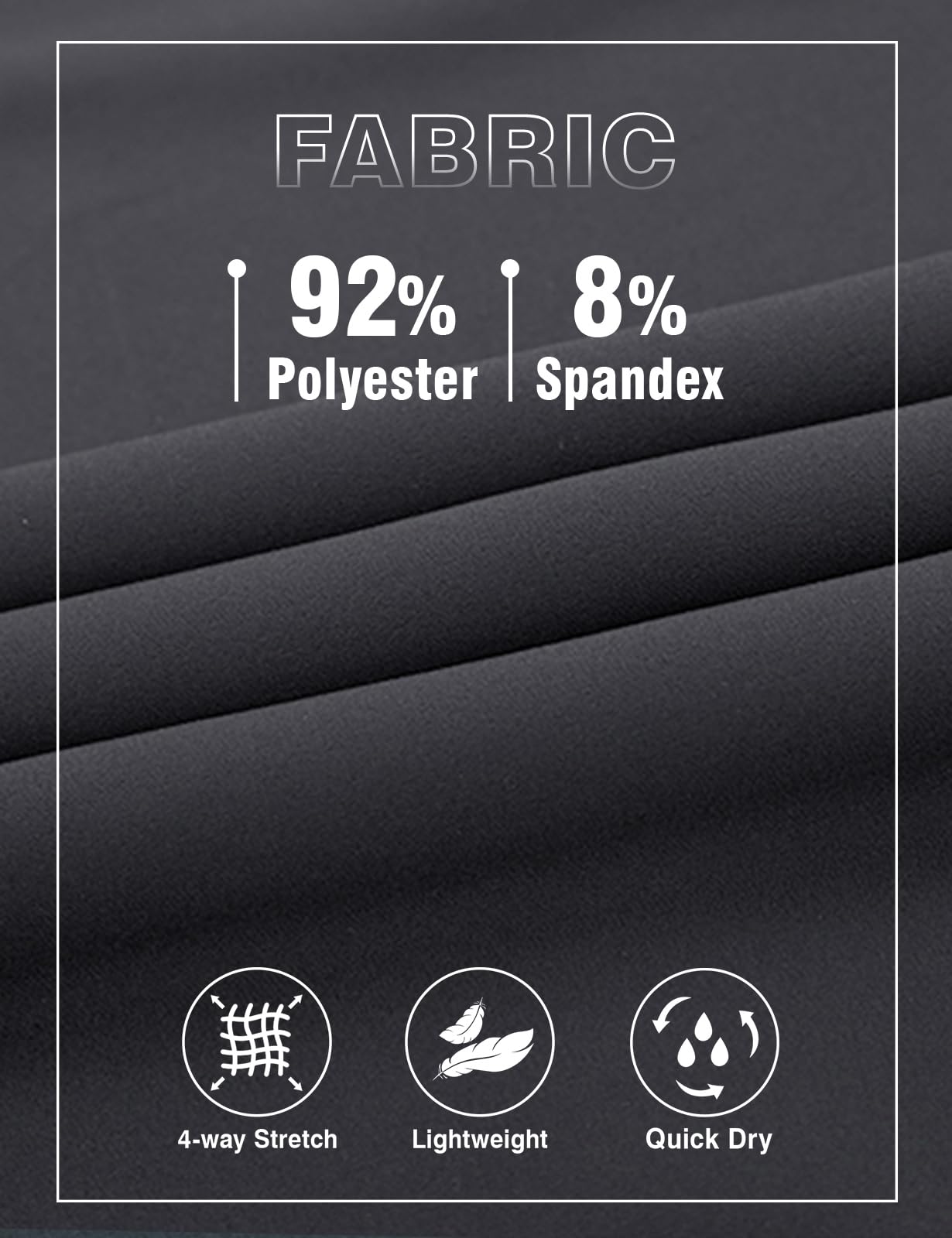 Quick Dry Fabric: Lightweight, breathable, moisture wicking, soft to skin, keeps you cool and comfortable