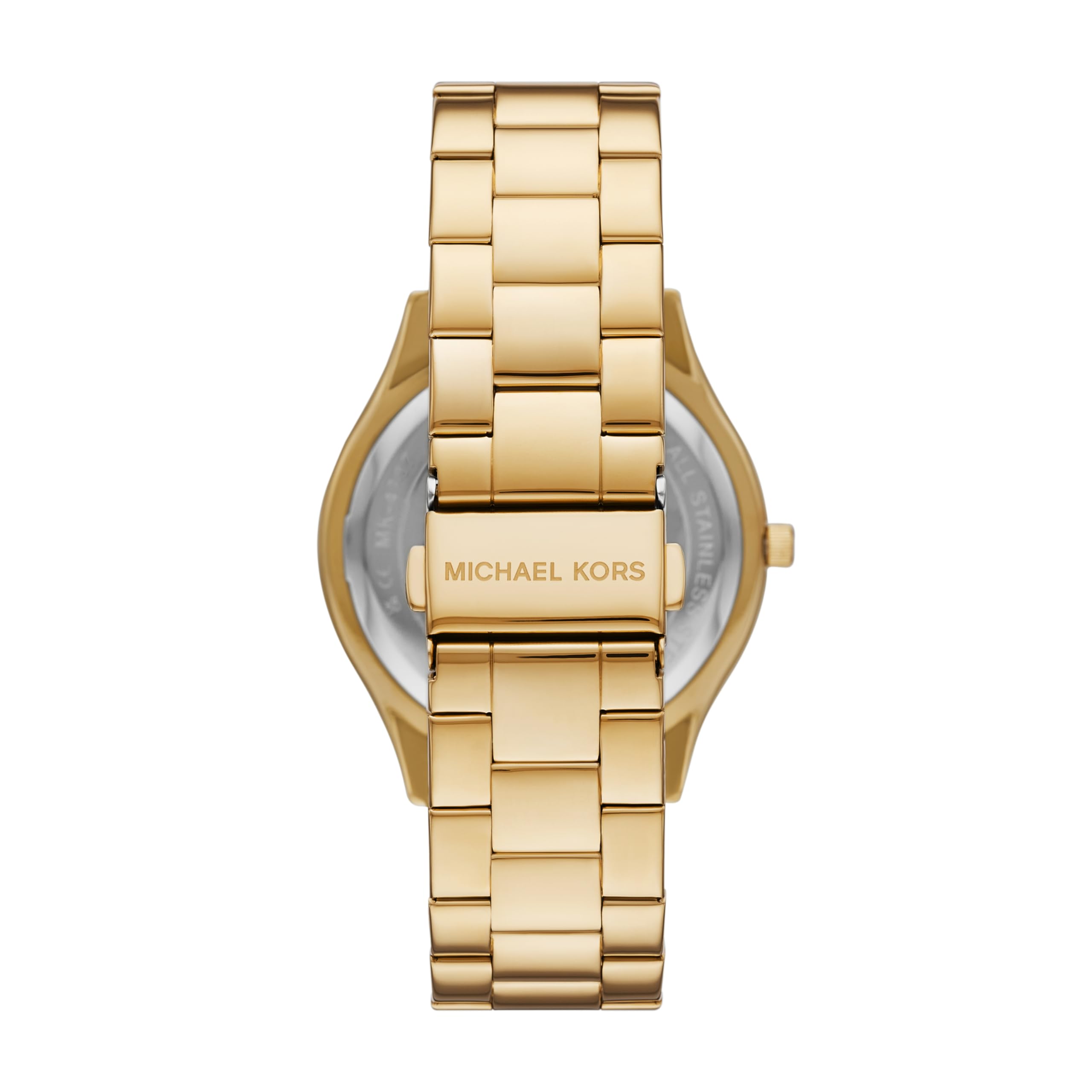 Michael Kors' 42mm Slim Runway watch features a gold pavé sunray dial, three-hand movement and gold-tone stainless steel bracelet.