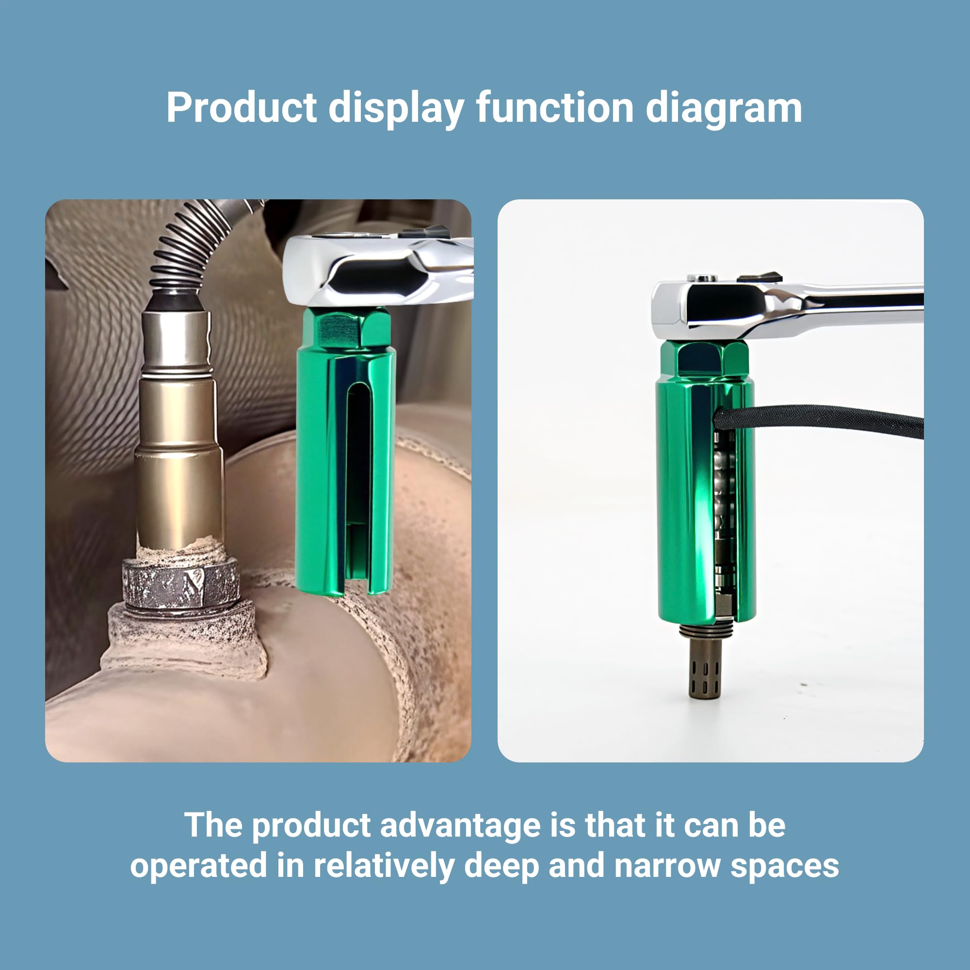 Material: This O2 sensor socket is made from a single piece of chromium-vanadium steel through stamping. This material offers excellent strength, allowing the oxygen sensor wrench to withstand high torque during use and ensuring it won't break. Additionally, the entire surface of the socket is coated with a layer of green anti-rust paint, preventing rust even if oil or water gets on it during use.